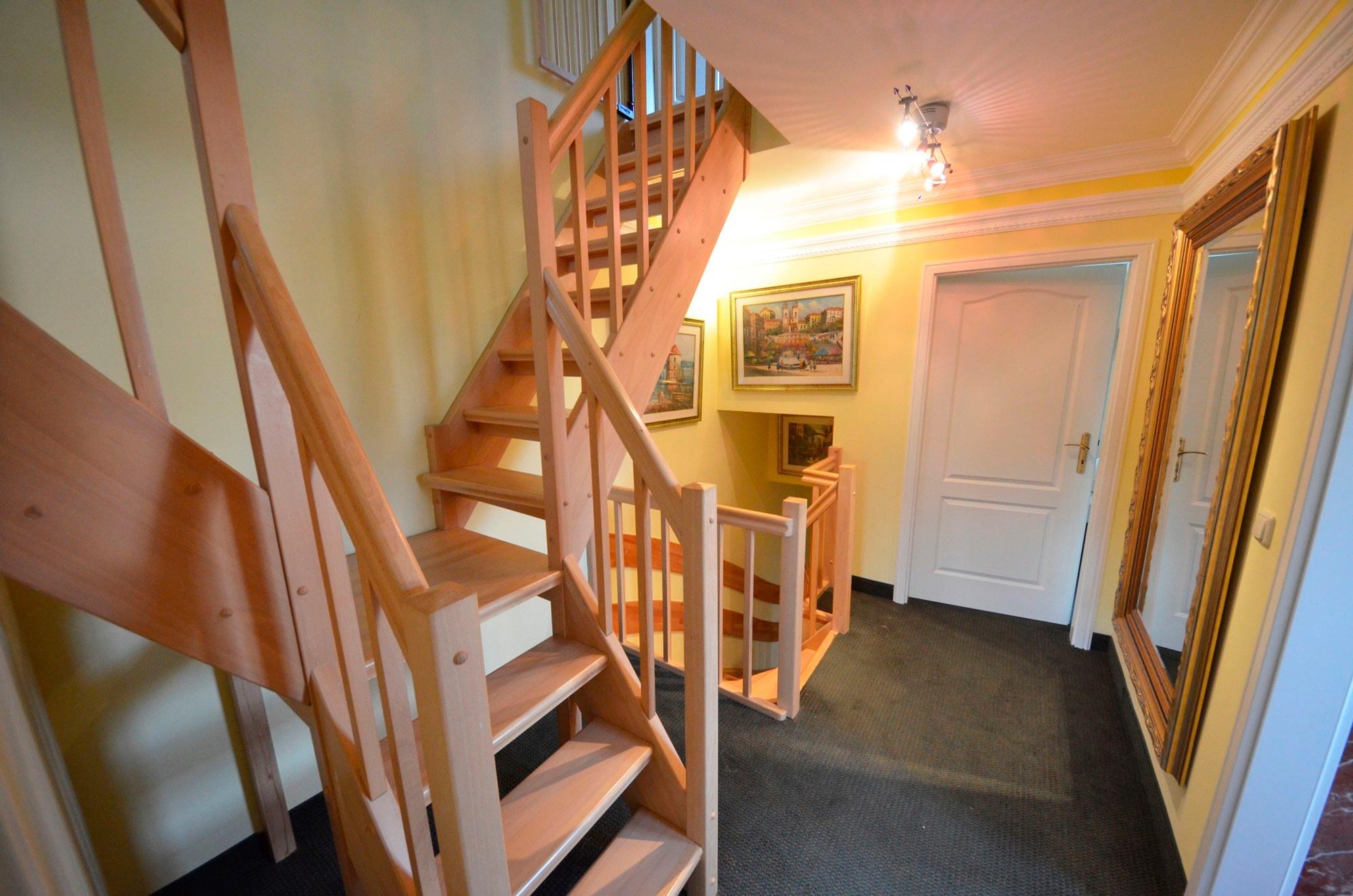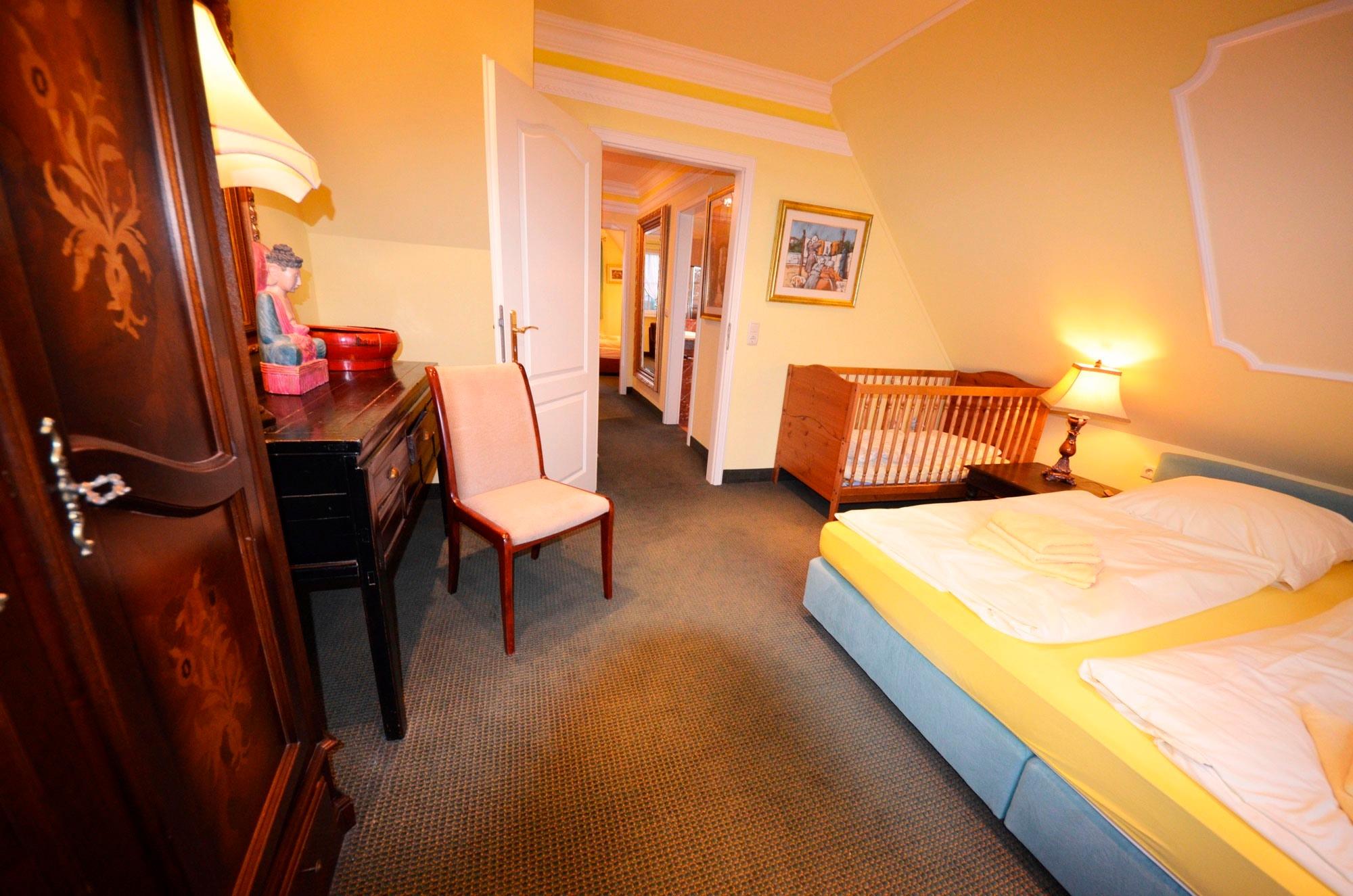 2 Doppel - Schlafzimmer, je mit 180x200er Bett, 1 x extra TV mit 72er Bild, aufgezogene Bettwäsche, Radiowecker, mit Bildern dekoriert, große Ganzkörperspiegel. Babybett 70 x 140 (kostenlos) in einem der Schlafzimmer mit Bettwäsche.
