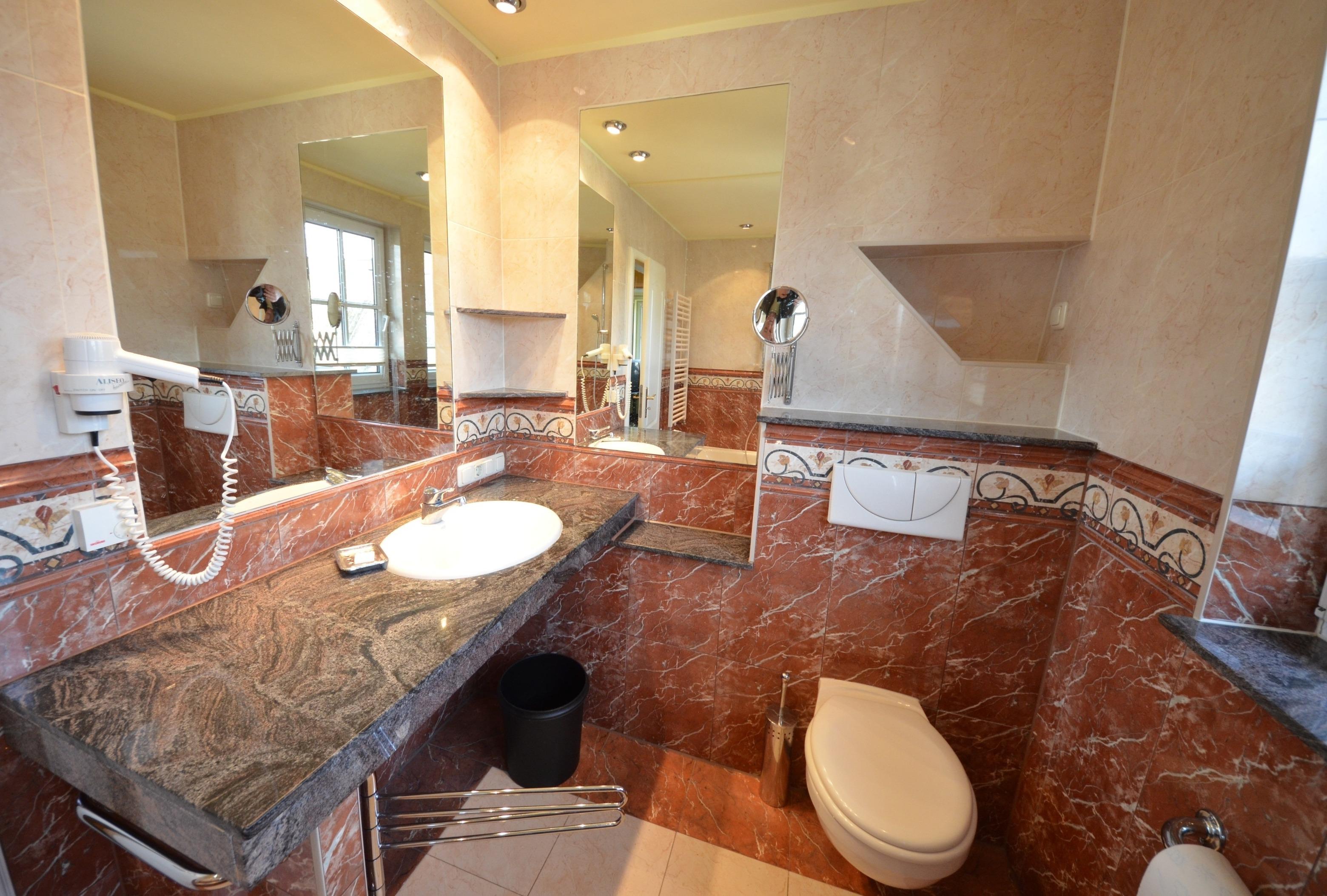 mit 2 großen Fenstern, Dusche in der Wanne mit Dusch - Trennwand. Fön, Schminkspiegel, Fußbodenheizung, Granit-Natursteinabdeckungen, großflächige Spiegel, schöne Sanitärausstattung in Pargamon, beheizbarer Handtuchhalter.