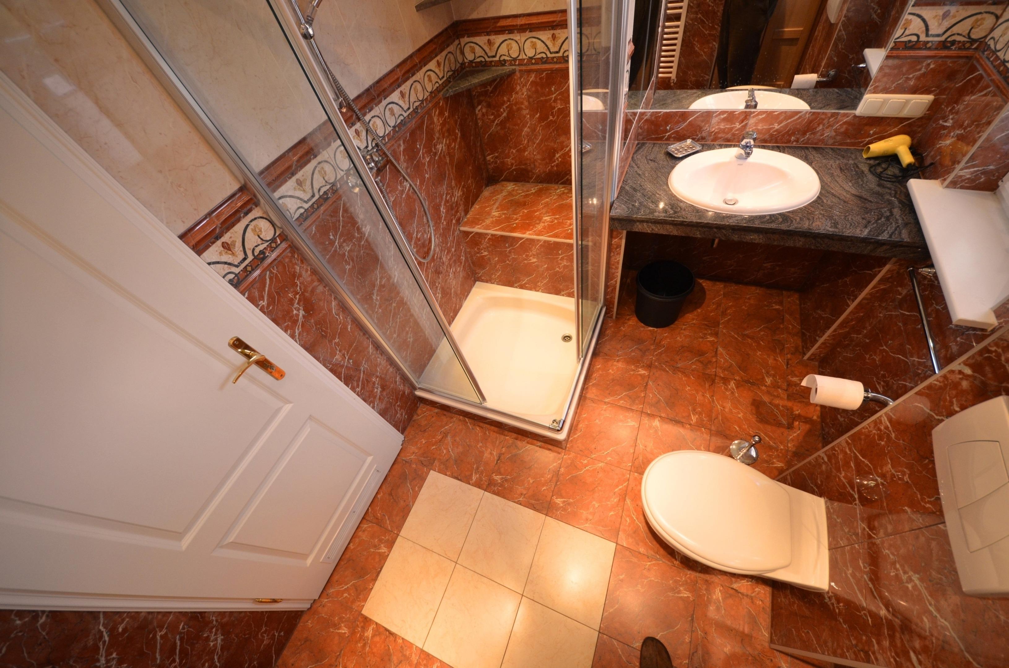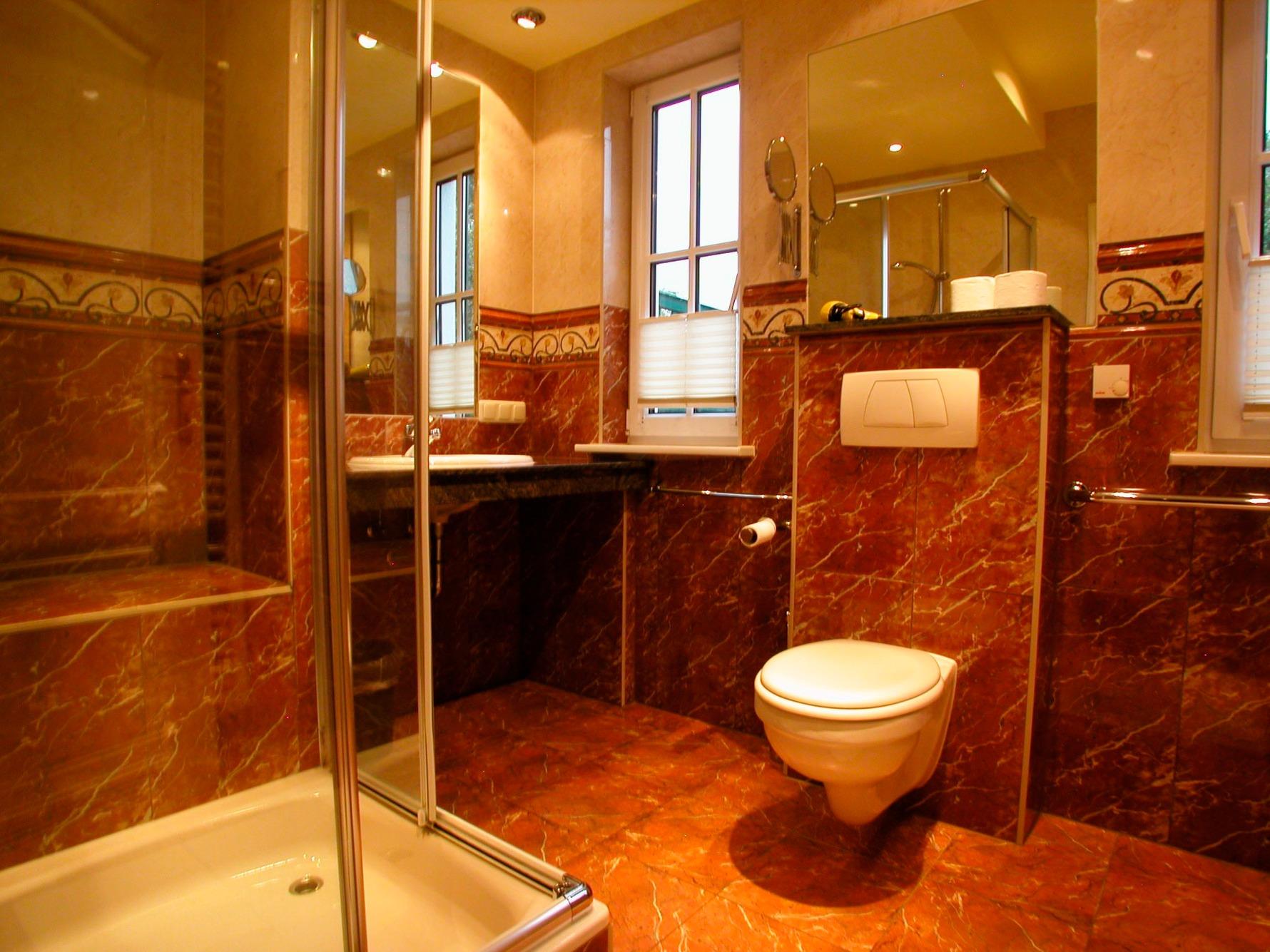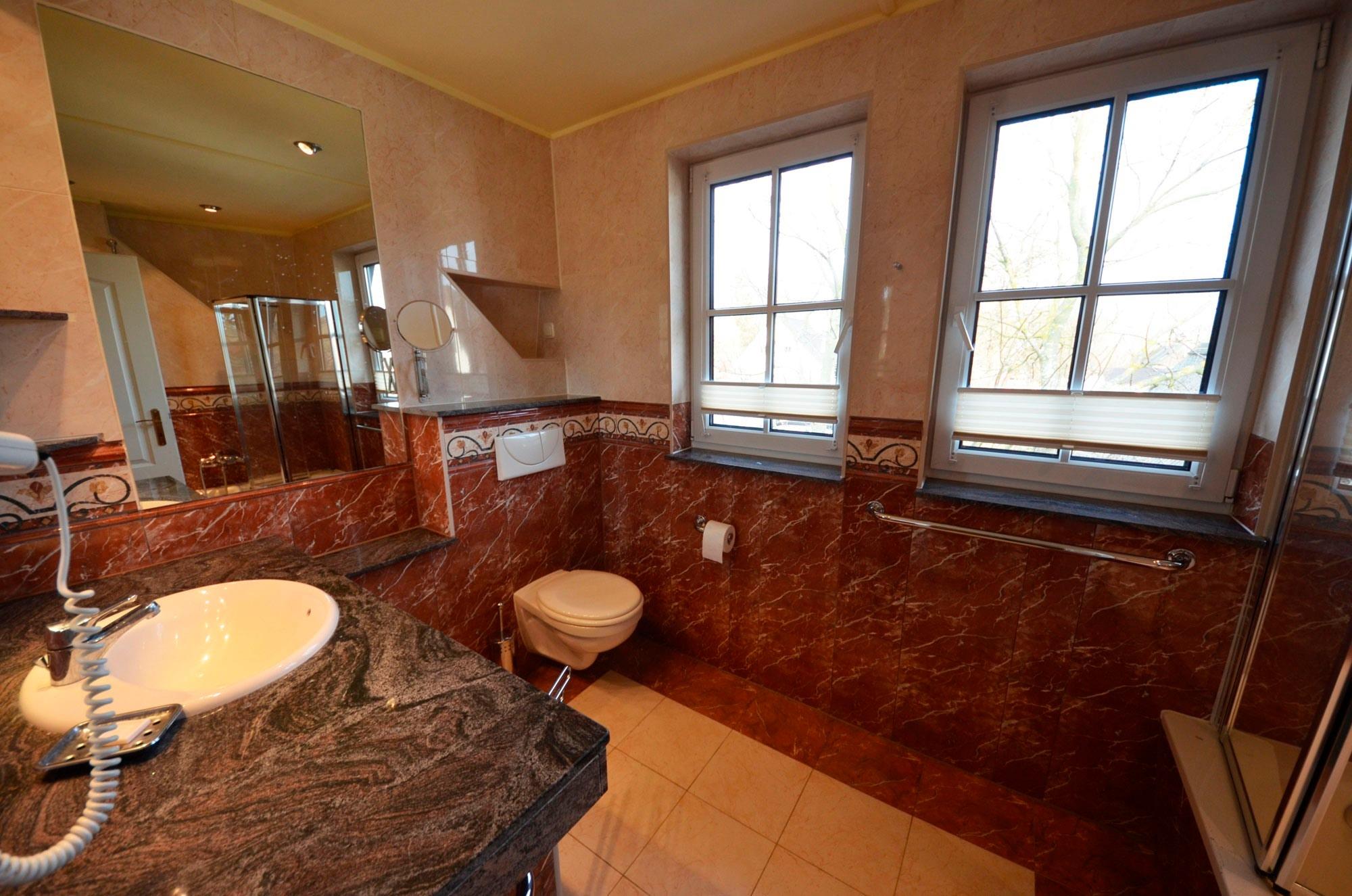 Mit 2 Fenstern, Glas-Dusche, Granitabdeckungen, Fön, Schminkspiegel, Fußbodenheizung, großflächige Spiegel, schöne Sanitärausstattung in Pergamon, beheizbarer Handtuchhalter