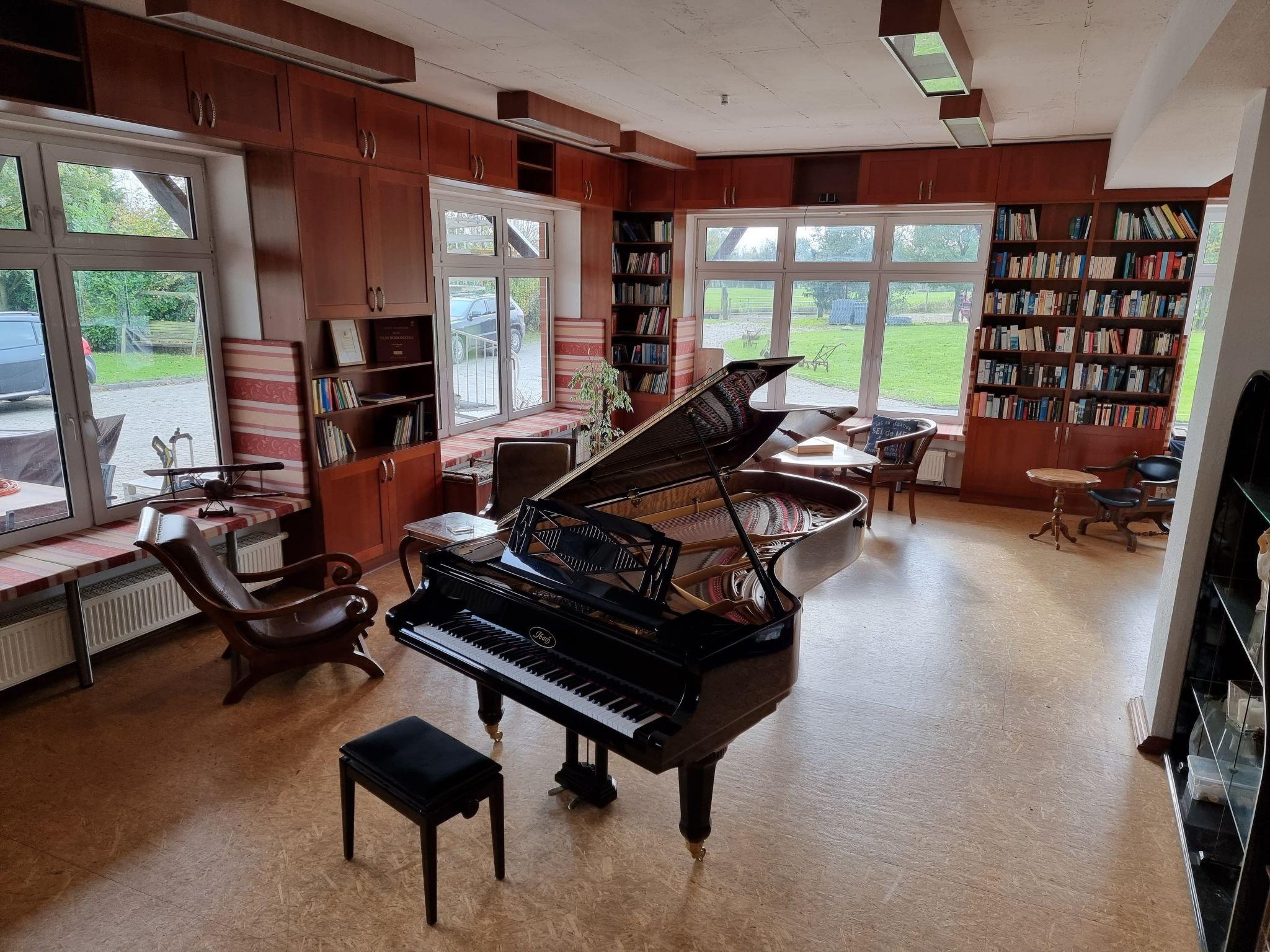 The Mozart flat for 4 people has a combined living/dining room with kitchenette, a shower room, a separate bedroom and an additional bunk bed on the upper floor, which is very popular with children and can be reached via a room-splitting staircase. This bunk has no headroom for adults, but also has a double bed and is of course also suitable for children. It also has a double bed and is of course also suitable for adults to sleep in. A high-quality, new Fenner piano in a shellac-polished antique case invites you to play. The entire gable wall is glazed, so that the view from the bright, friendly flat can wander over the "deck" into the nature reserve. The flat can be reached via its own entrance directly from the "ship's deck".
