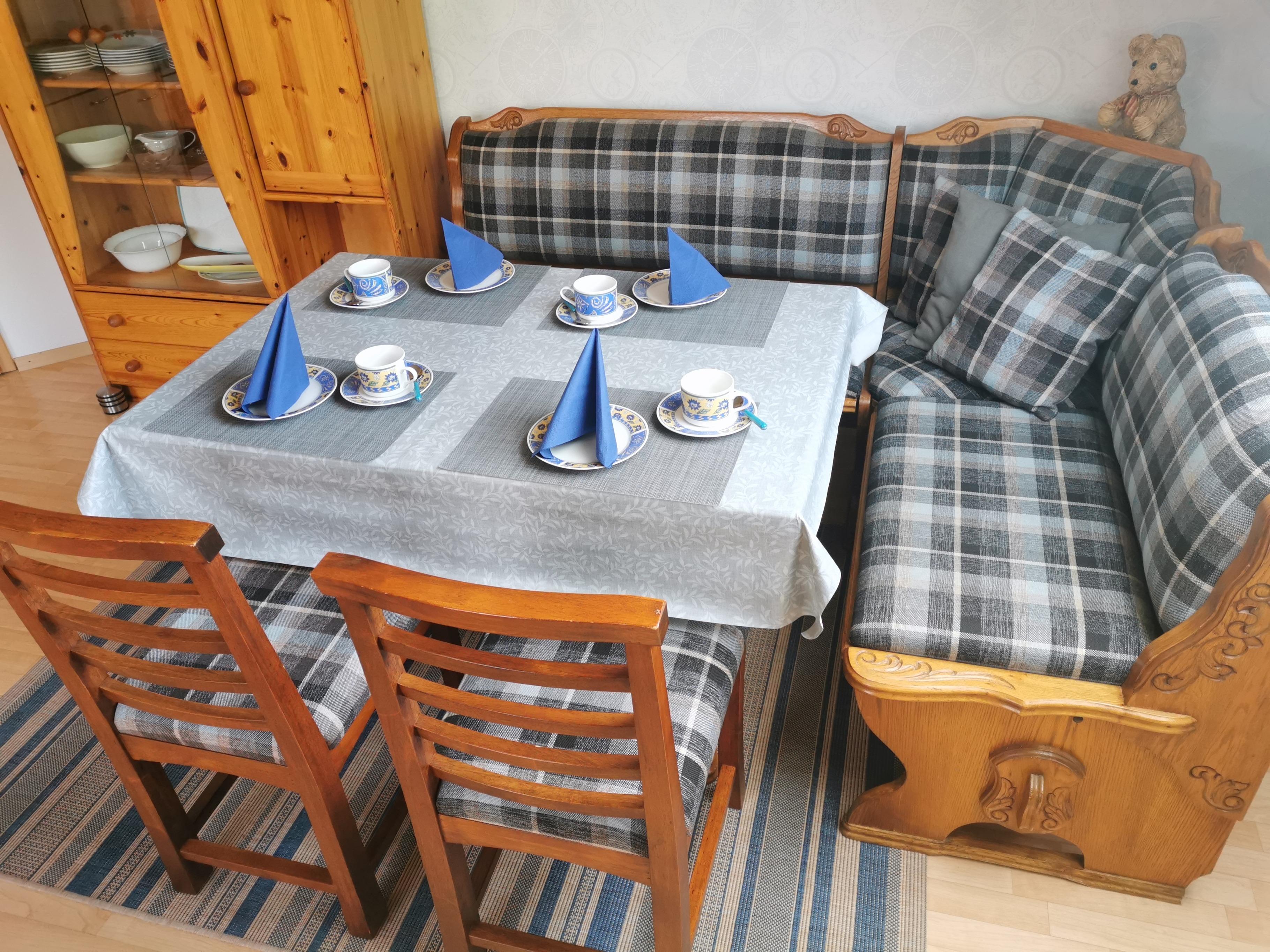 gemütliche Eckbank, Tisch, Stühle, Hochstuhl