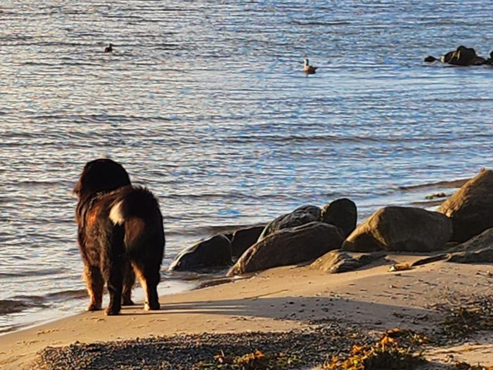 The house is located on a 610 square metre green area with bushes and hedges without fencing. The natural beach is 100 metres away as the crow flies. The modern promenade, which was redesigned in 2020, is a 500 metre walk away.