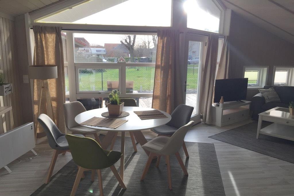 Vores danske sommerhus ligger 5 minutter fra stranden og den store promenade. Feriehuset er lyst og venligt indrettet i skandinavisk stil. Der er to soveværelser med dobbeltsenge (madrasser 160/200), et soveværelse med enkeltseng (funktionel seng: enkelt eller dobbelt / madrasser 2x80/200). Ideel til 2-6 personer. Boligarealet strækker sig over 95m². Køkkenet er åbent og kombineret med spisestue og stue. I stuen finder du et dejligt sofahjørne samt fladskærms-tv og brændeovn. Herfra har I udgang til den delvist overdækkede terrasse, hvor I kan sidde dejligt, selvom vejret ikke er helt til det. Udstyret omfatter også en vaskemaskine og en babyseng (Stardust model) fra Bugaboo.