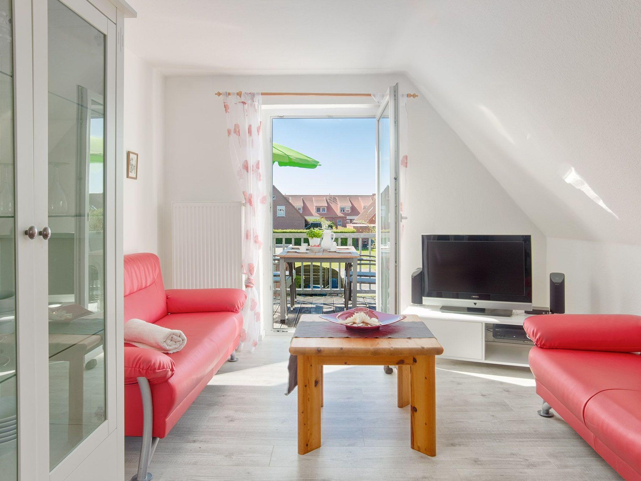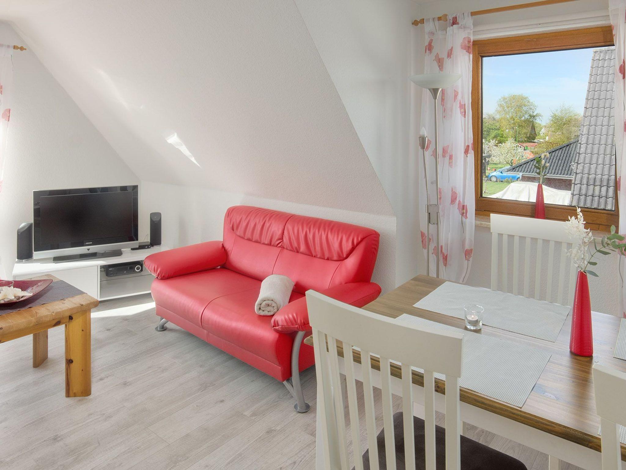 Die schöne, helle Wohnung bietet viel Platz und ist modern eingerichtet. Wohnfreundliche Möbel, LCD-TV und CD-Player sorgen für Wohlbefinden. Der Wohnbereich ist mit einem Laminat-Fußboden ausgestattet. Sie ist besonders interessant für Familien oder max. 4 Erwachsene und 1 Kleinkind, da sie über 1 Schlafzimmer mit Doppelbett und 1 Schlafzimmer mit Einzelbetten verfügt. Hochstuhl und Reisebettchen sind vorhanden. Das Badezimmer mit Dusche ist hell gefliest. Die Küche mit kleinem Essbereich, ist mit einem Herd mit vier Platten, Backofen, Mikrowelle, Kaffeemaschine, Wasserkocher etc. ausgestattet. Ebenso können Fahrräder gegen eine kleine Gebühr genutzt werden.