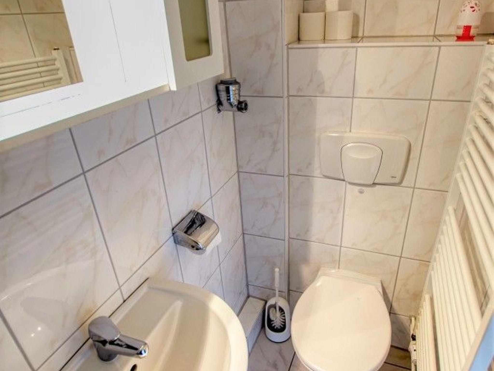 Gefliestes Badezimmer mit Duschkabine, Handtuchhalter und WC