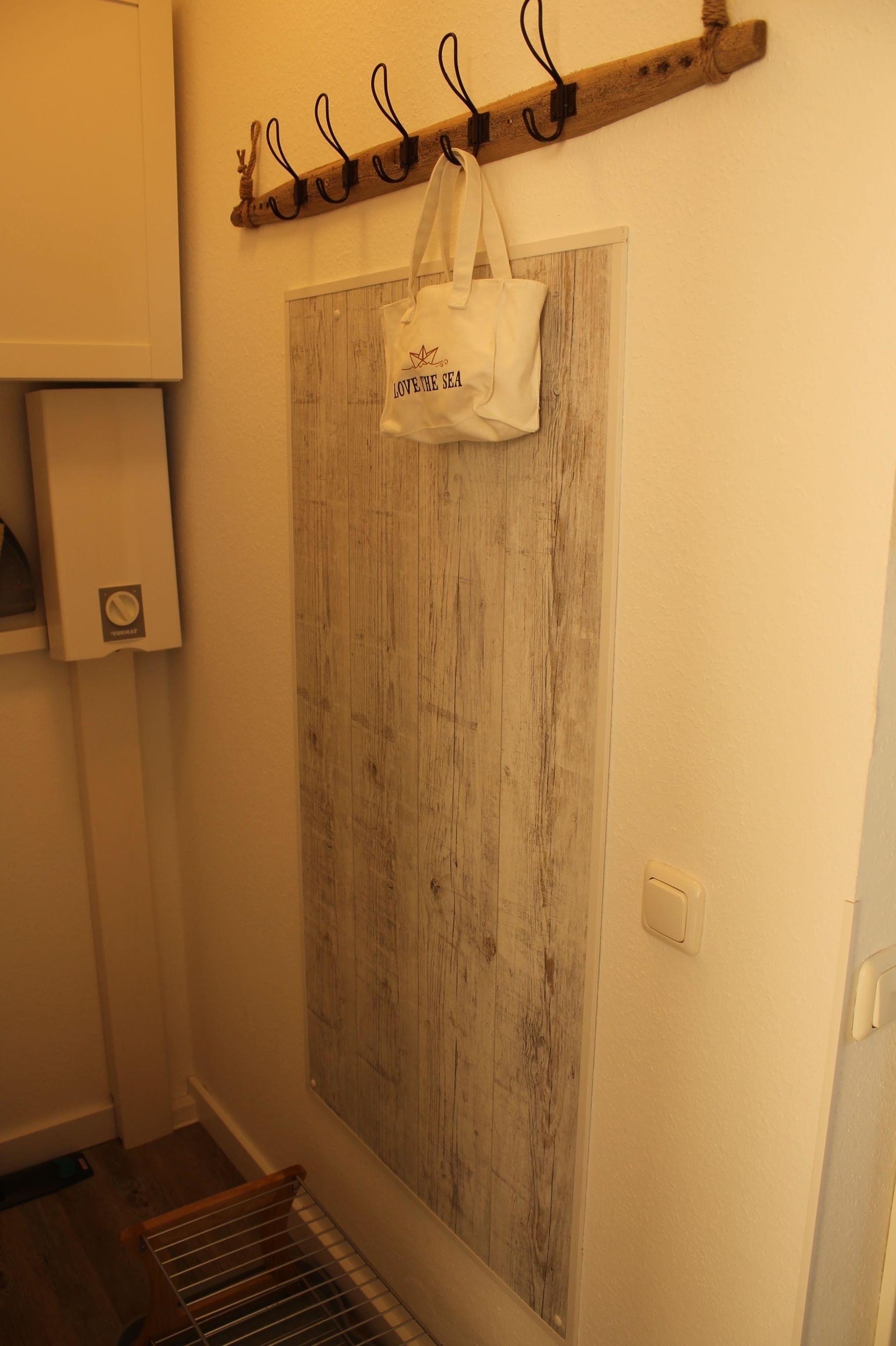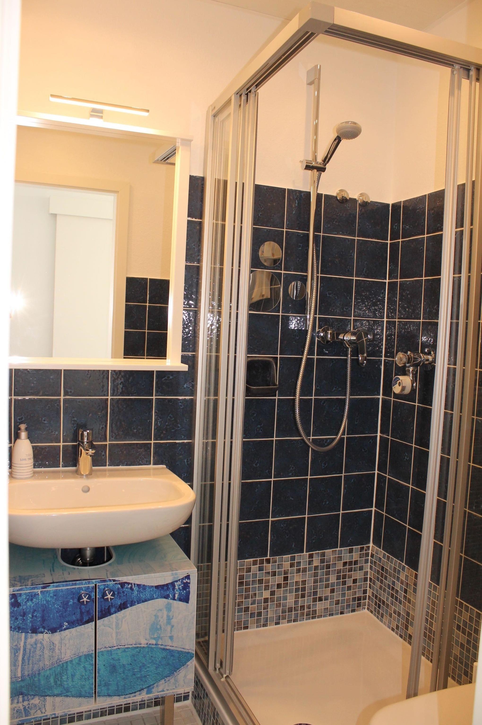 Im Badezimmer finden Sie ein wandhängendes WC, einen Fön, einen Handtuchheizkörper und ein e Dusche. Neben der Eingangstür befindet sich ein kleiner offener Garderobenraum für Ihre Jacken und Schuhe.