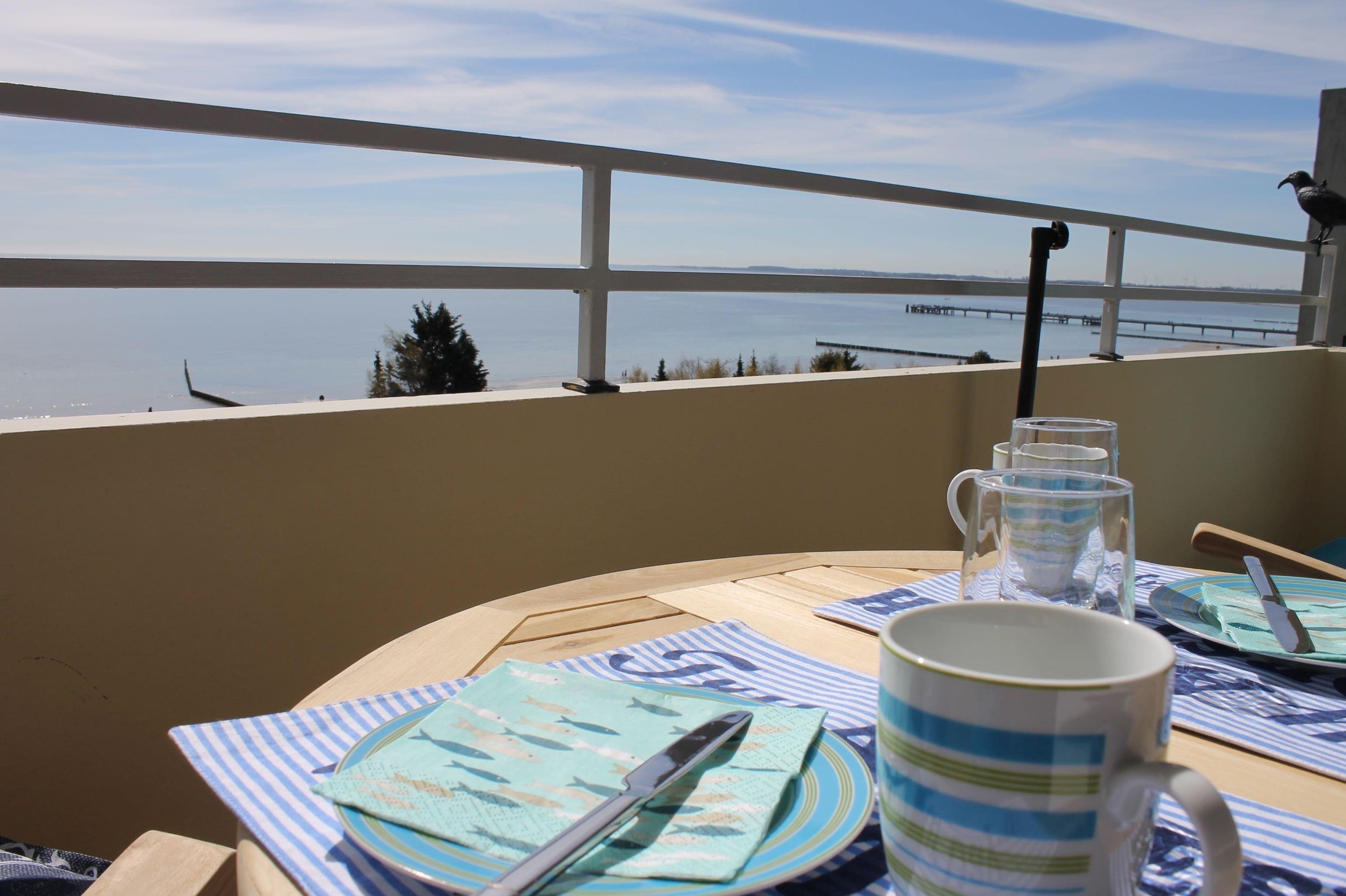 Großer Südbalkon mit grandiosem Meerblick bis zum Horizont. Auf der rechten Seite bis zur Seebrücke/Hafen. Die Sonne scheint bis zum Nachmittag auf den Balkon.