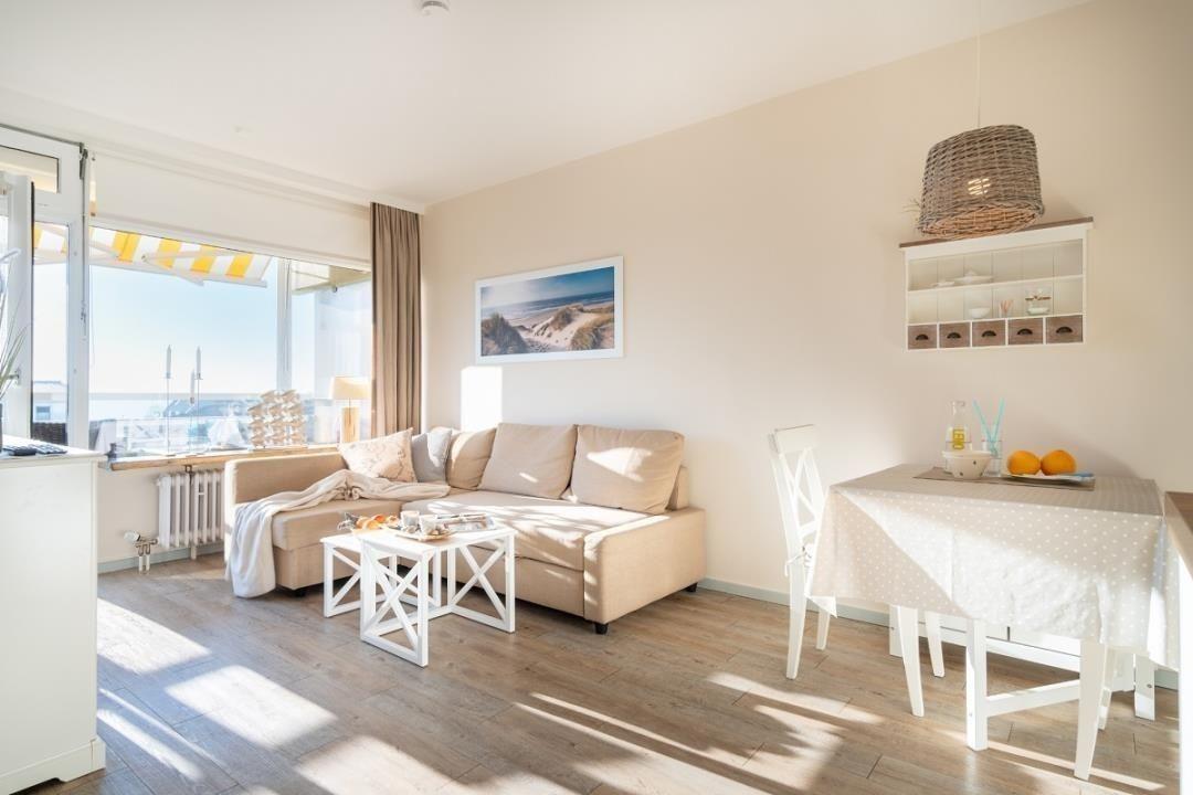 Die 35m²-Wohnung befindet sich in der 2. Etage im Haus "Belvedere" am Südstrand und wurde zuletzt 2020 modernisiert.