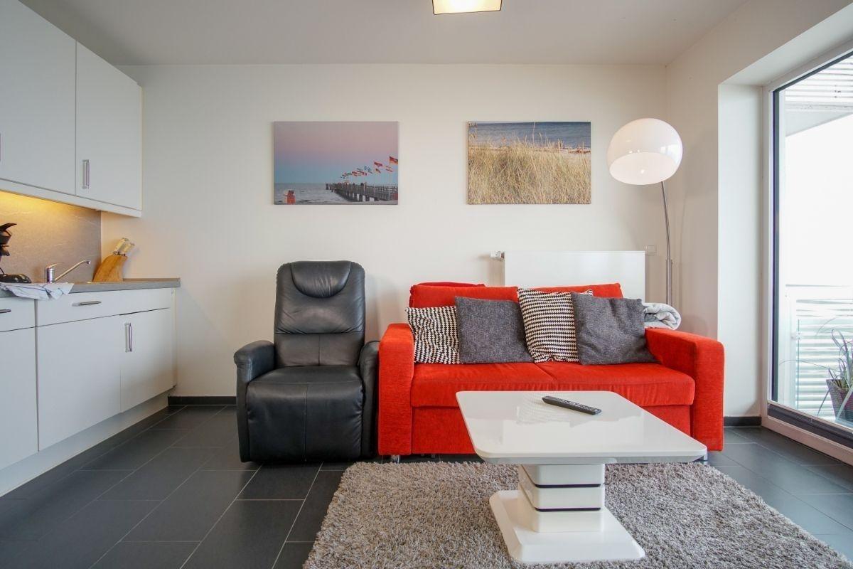 Vom Wohnzimmer aus gelangen Sie auf den Balkon mit traumhaften Blick zum Strand und zur Ostsee.