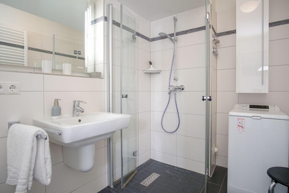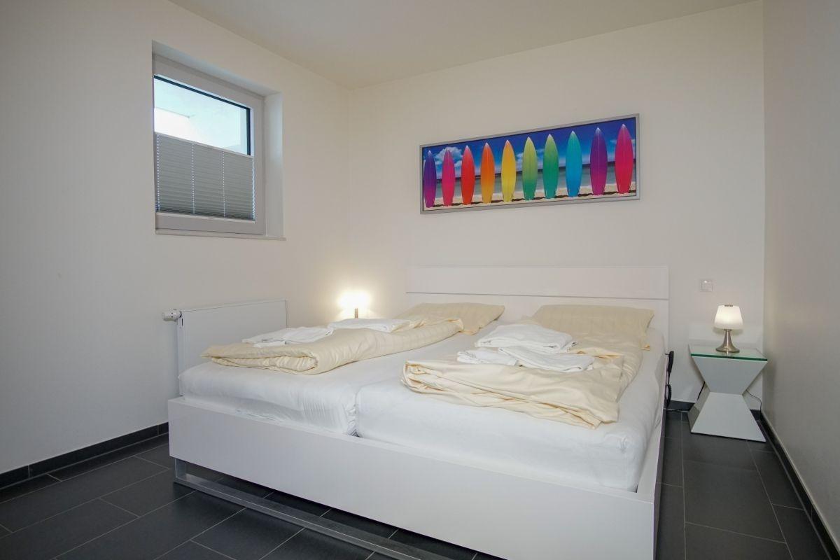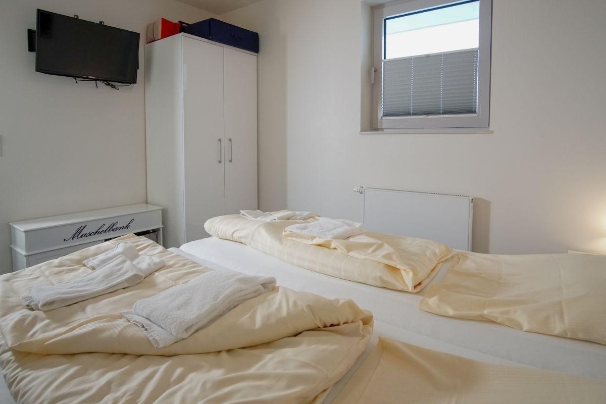 Das Schlafzimmer verfügt über ein gemütliches Doppelbett (mit zwei Matratzen) und einen eigenen TV. Der offene Küchenbereich ist, für den Urlaubsbedarf, voll ausgestattet. Ein Backofen und ein Geschirrspüler gehören ebenso dazu, wie die Kaffeemaschine, der Wasserkocher und ein Toaster. Geschirr und Besteck sind ausreichend vorhanden. Das Badezimmer ist mit einer Dusche mit Glastrennwand ausgestattet.
