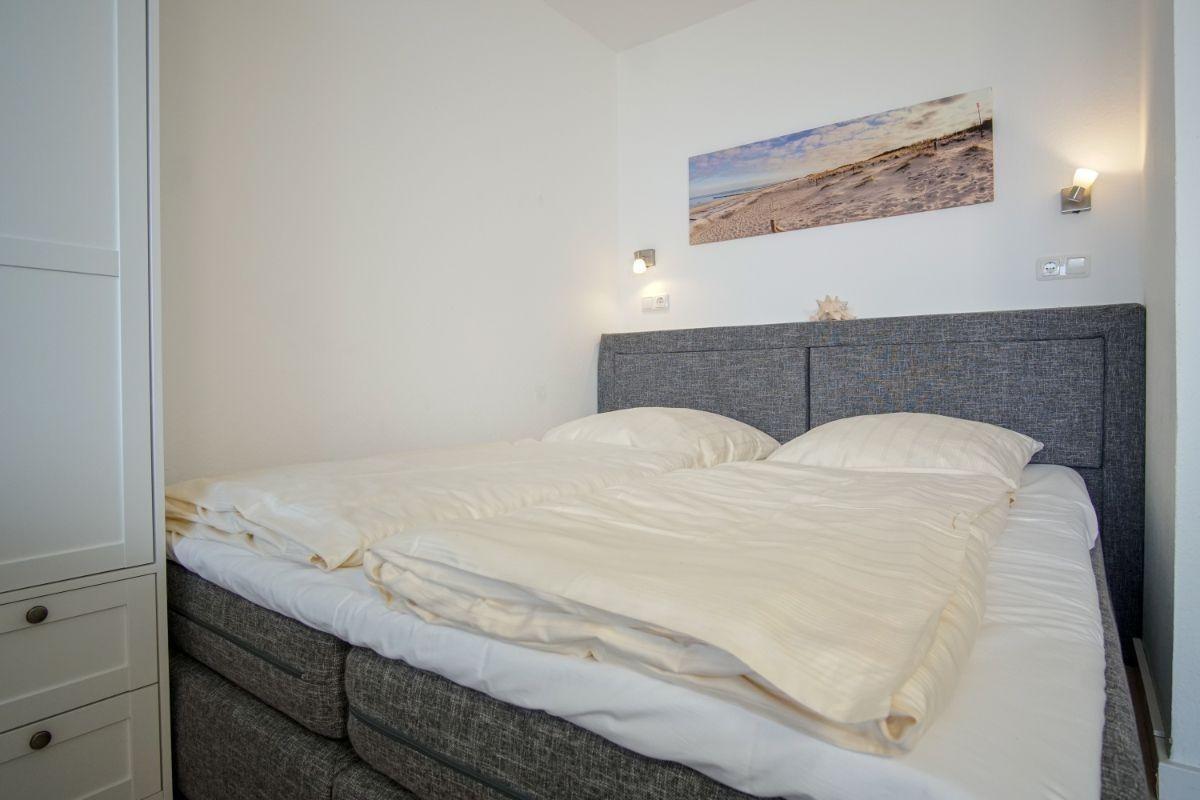 Die zuletzt 2021 modernisierte 35m²-Wohnung im Haus "Sanddorn" am Südstrand verfügt über einen großzügigen Wohn-Schlafbereich mit einem komfortablen Doppelbett im hinteren Bereich, einer gemütlichen Sofaecke mit Flatscreen-TV und der Essecke für drei Personen.