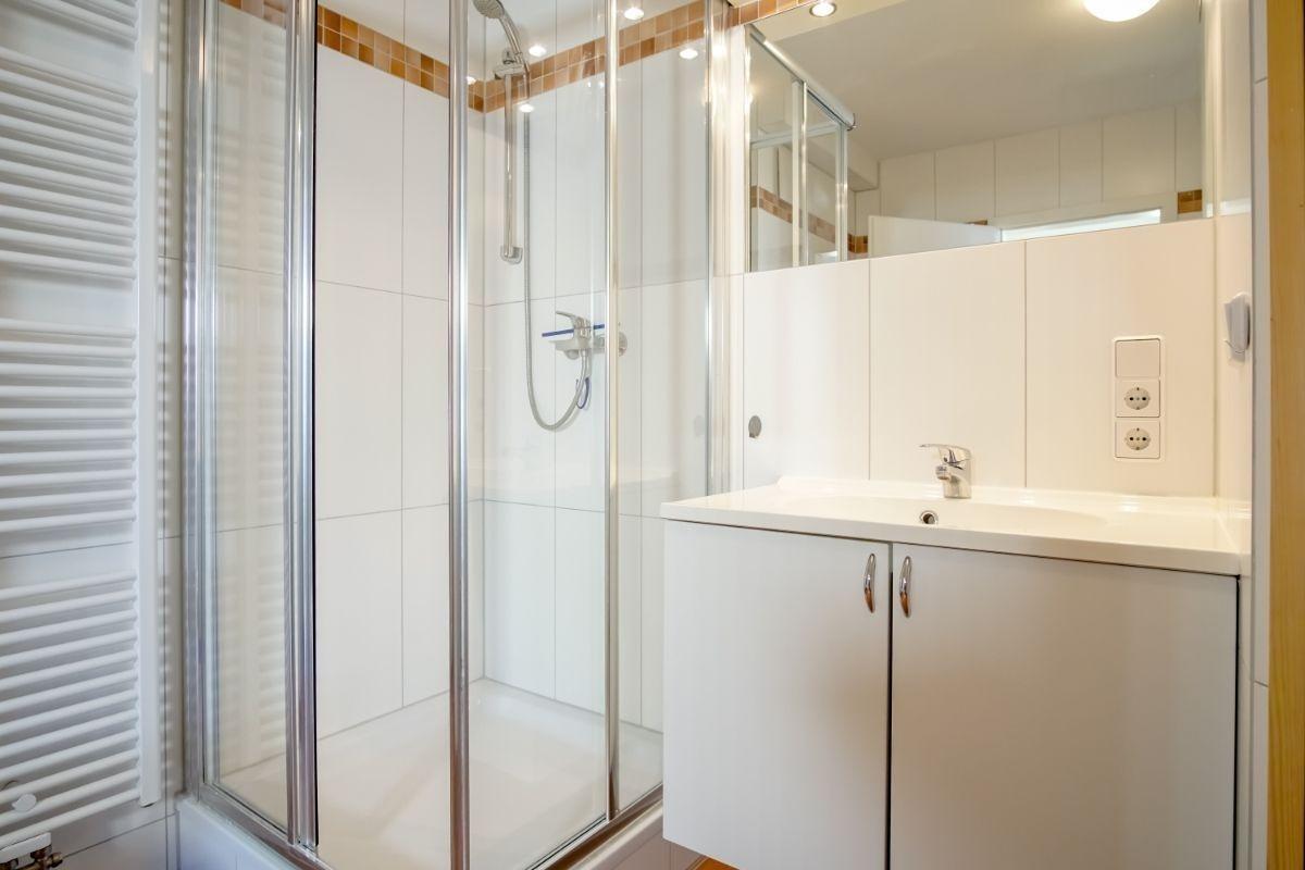 Das Wellnessbad präsentiert sich neben der Dusche mit Kabine, mit einer wohnungseigenen Sauna und einem Whirlpool.