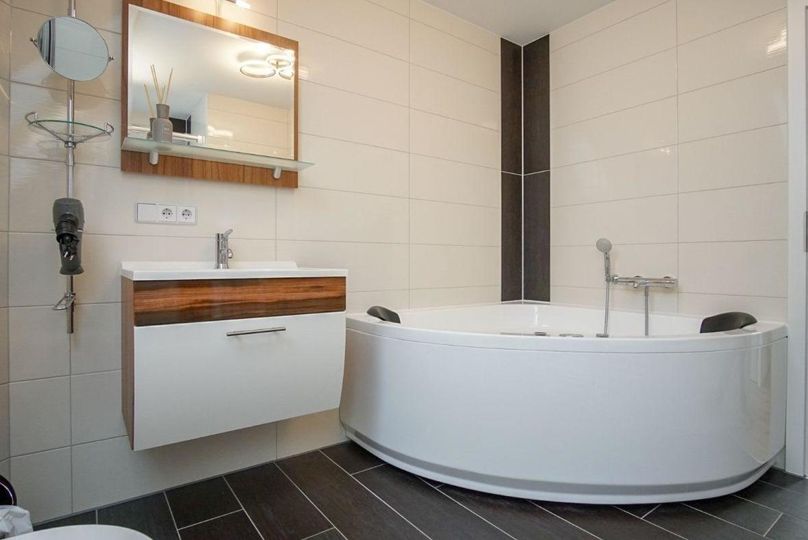 Das Wellnessbad präsentiert sich neben der Dusche mit Kabine, mit einer wohnungseigenen Sauna und einem Whirlpool.