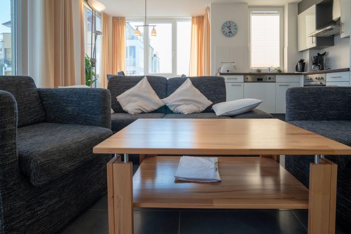 Die 51 qm-Wohnung befindet sich in der 1. Etage in der Anlage "Strandpark". Der lichtdurchflutete Wohnbereich, mit direktem Zugung zum Ostbalkon, ist mit einer gemütlichen Sofaecke, TV, Spielen, einem Kaminofen u.v.m. ausgestattet. Der offene Küchenbereich ist, für den Urlaubsbedarf, voll ausgestattet. Eine Kaffeemaschine gehört ebenso dazu, wie der Wasserkocher und ein Toaster. Geschirr und Besteck sind ausreichend vorhanden. Außerdem stehen Ihnen noch ein Backofen und ein Geschirrspüler zur Verfügung. Vier Personen finden in zwei getrennten Schlafräumen ausreichend Platz: das Elternschlafzimmer verfügt über ein Doppelbett (ca. 160x200cm), das Kinderschlafzimmer hält ein robustes Etagenbett (2x ca. 90x190cm) für Sie vor.