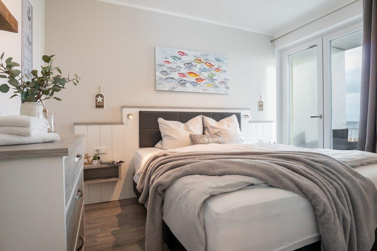 Willkommen in der Meerblickvilla - näher ans Meer geht es kaum. Die Wohnung "Strandliebe" befindet sich in der ersten Etage und verfügt über drei Zimmer auf ca. 66 m² - aufgeteilt auf zwei Schlafzimmer, ein Duschbad und den lichtdurchfluteten Wohn- und Essbereich mit angrenzender Küchenzeile. Das besondere Highlight ist der Süd-Balkon mit traumhaften Ausblick zum Meer.