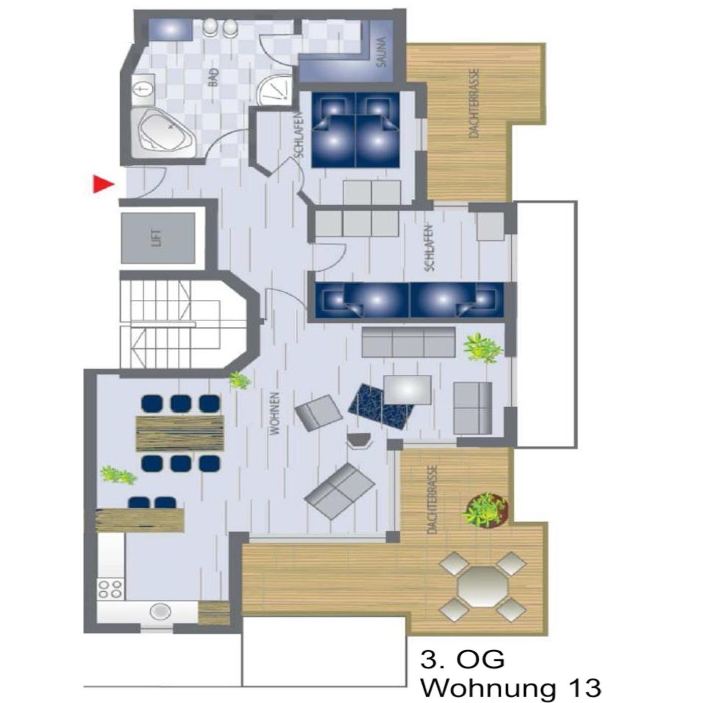 Die Wohnung befindet sich im 3. Stock. Ein Fahrstuhl ist im Haus vorhanden. Die Dachterrassen sind nach Norden und Westen ausgerichtet.