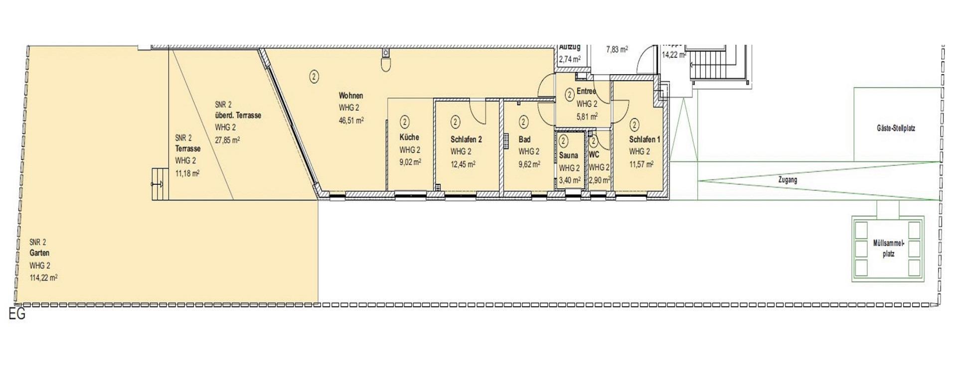 Die Wohnung befindet sich im Erdgeschoss. Die Terrasse ist nach Süd-Westen ausgerichtet.