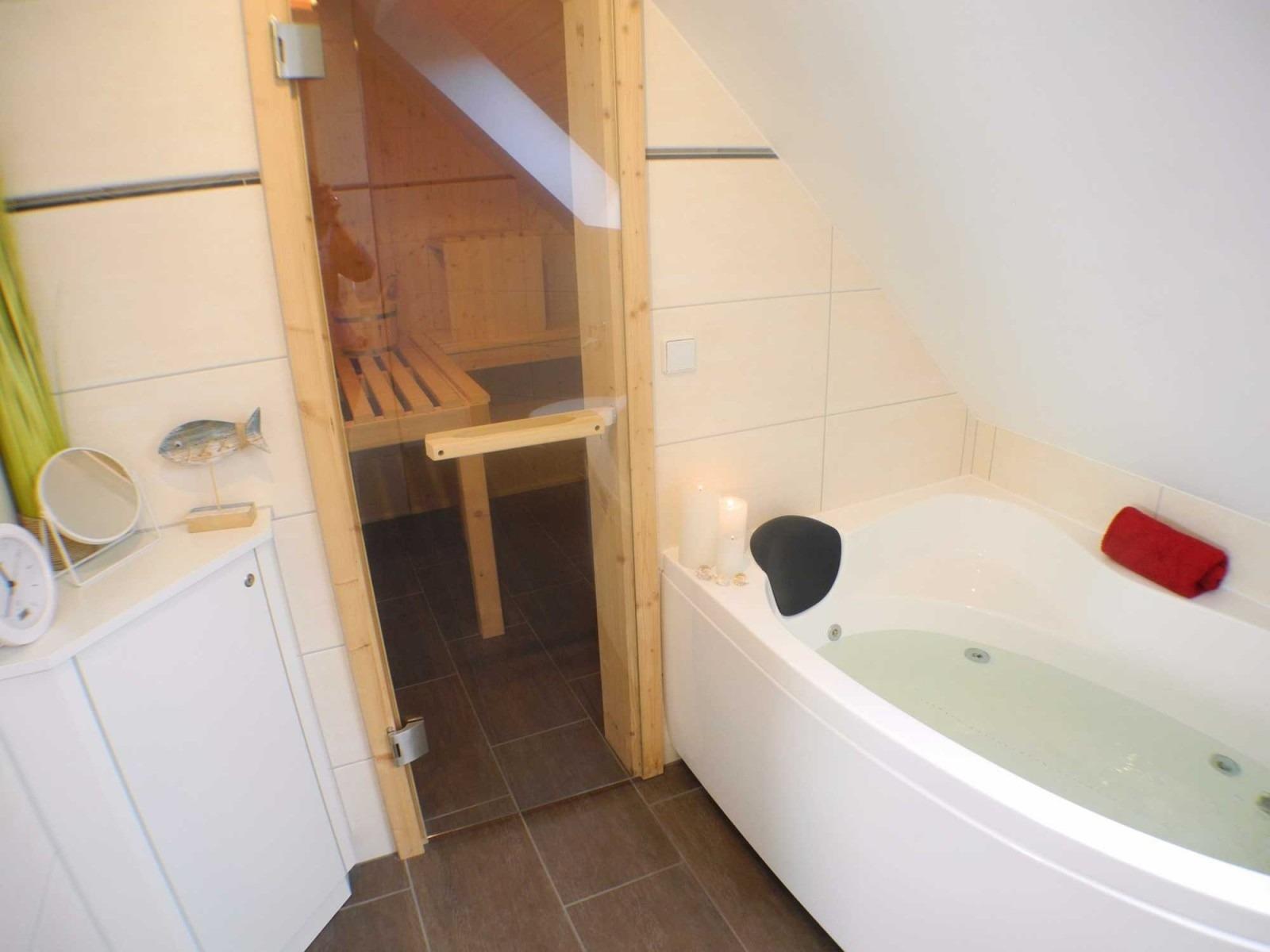 Das Wellnessbad punktet mit Sauna und Whirlpool.