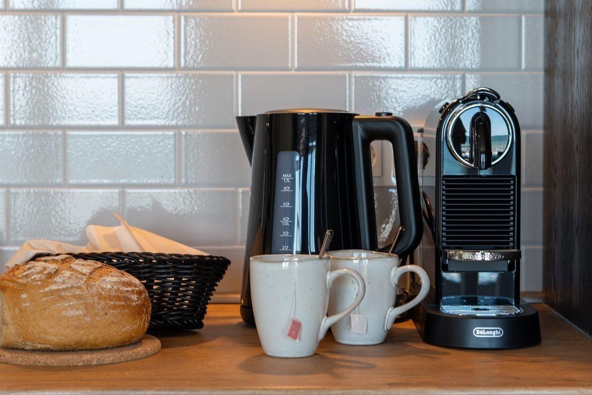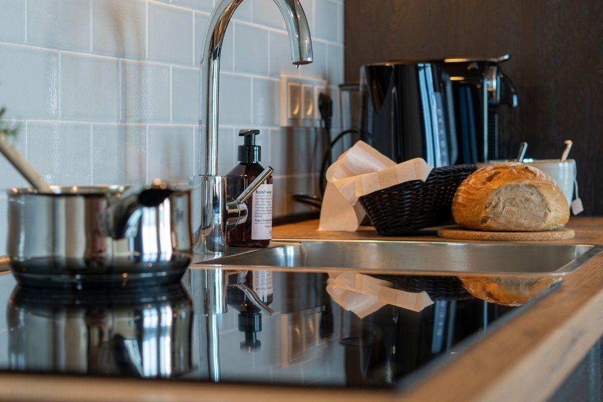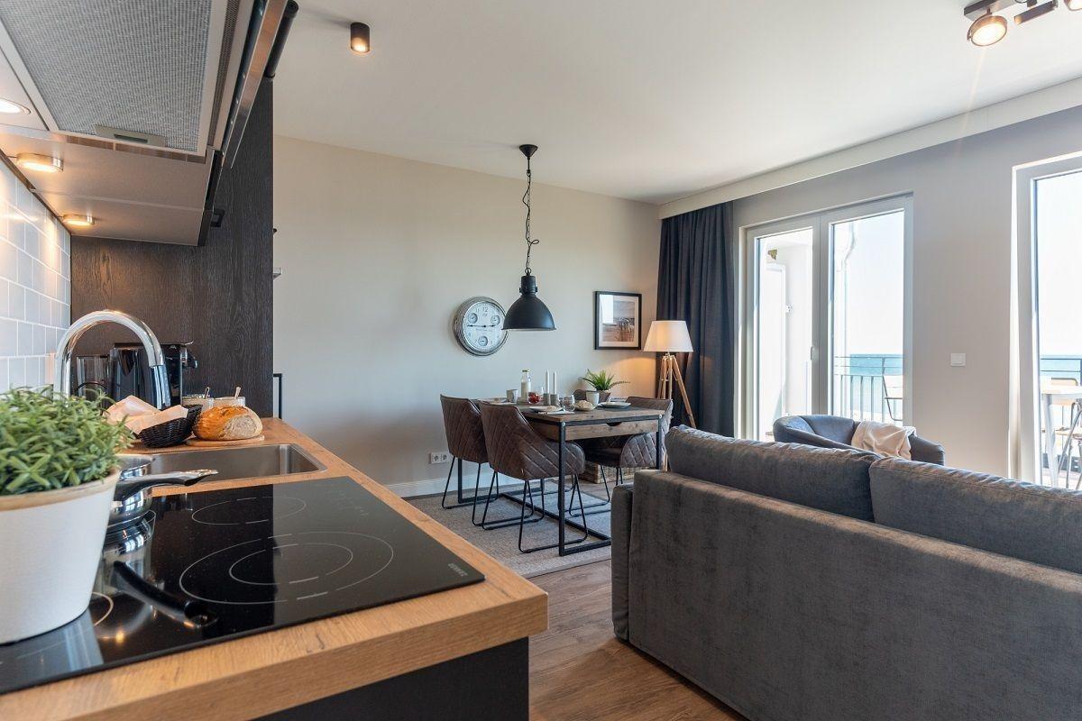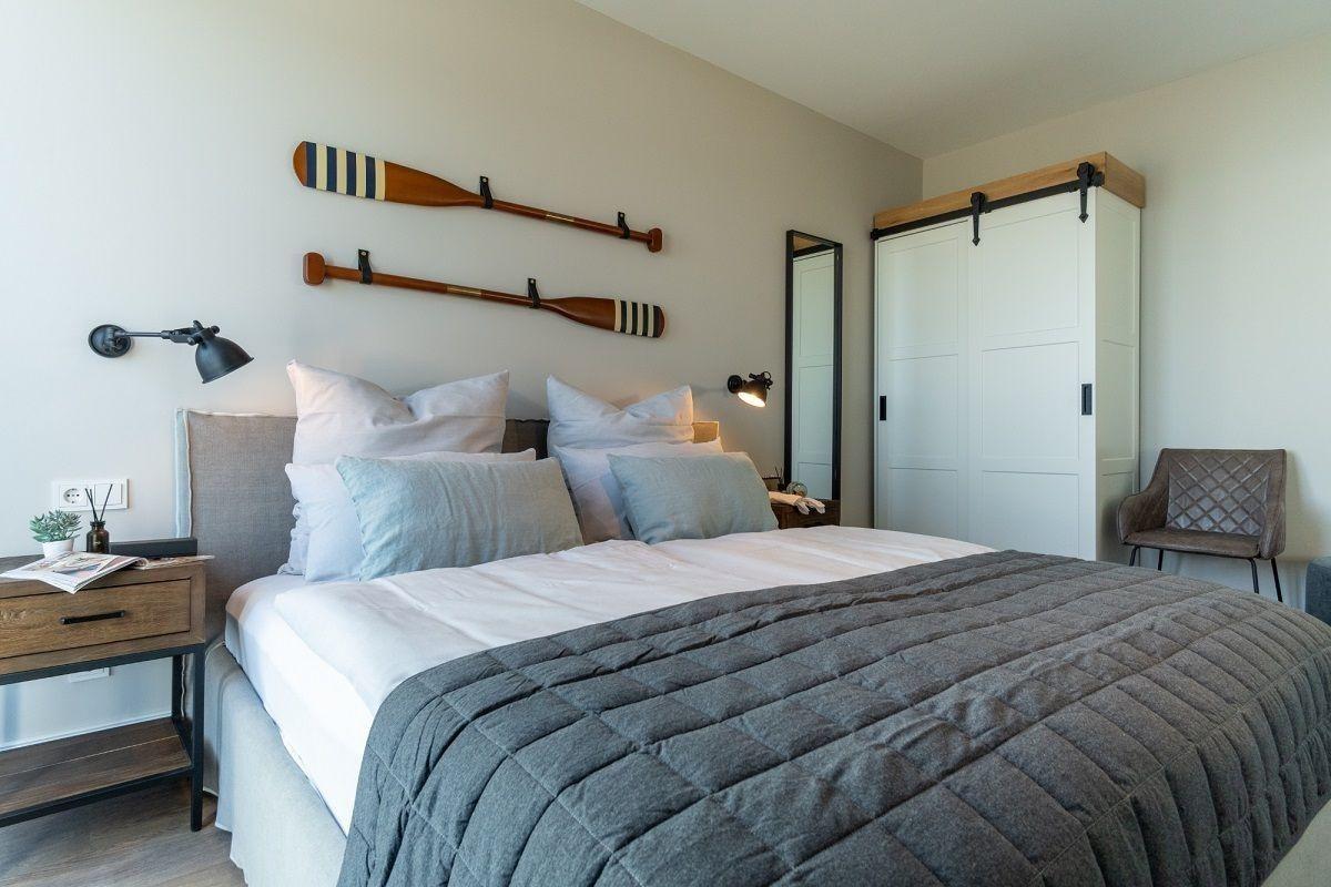 Das lichtdurchflutete Wohn-Schlafzimmer ist mit einer gemütlichen Sofaecke (Schlafsofa 140*200cm) einem Smart-TV und einem Deckenventilator ausgestattet. Das Schlafzimmer mit Verdunklungsmöglichkeit verfügt über ein gemütliches Doppelbett (ca. 191*213cm) und ebenfalls einem Smart-TV. Vom maritimen und im modernen Wohndesign (Cosman Interior) eingerichteten Wohn- und Schlafbereich aus haben Sie einen zauberhaften Blick zum Meer. Die angrenzende offene Küche ist mit allen Annehmlichkeiten voll ausgestattet. Für Kaffeeliebhaber steht neben einer Filterkaffeemaschine noch eine Nesspressomaschine zur Verfügung. Das Badezimmer ist mit einer ebenerdigen Dusche mit Glastrennwand ausgestattet. Das besondere Highlight ist die wohnungseigene Sauna, sowie eine Wellnessdusche - hier lässt es sich auch an Schietwettertagen herrlich relaxen.