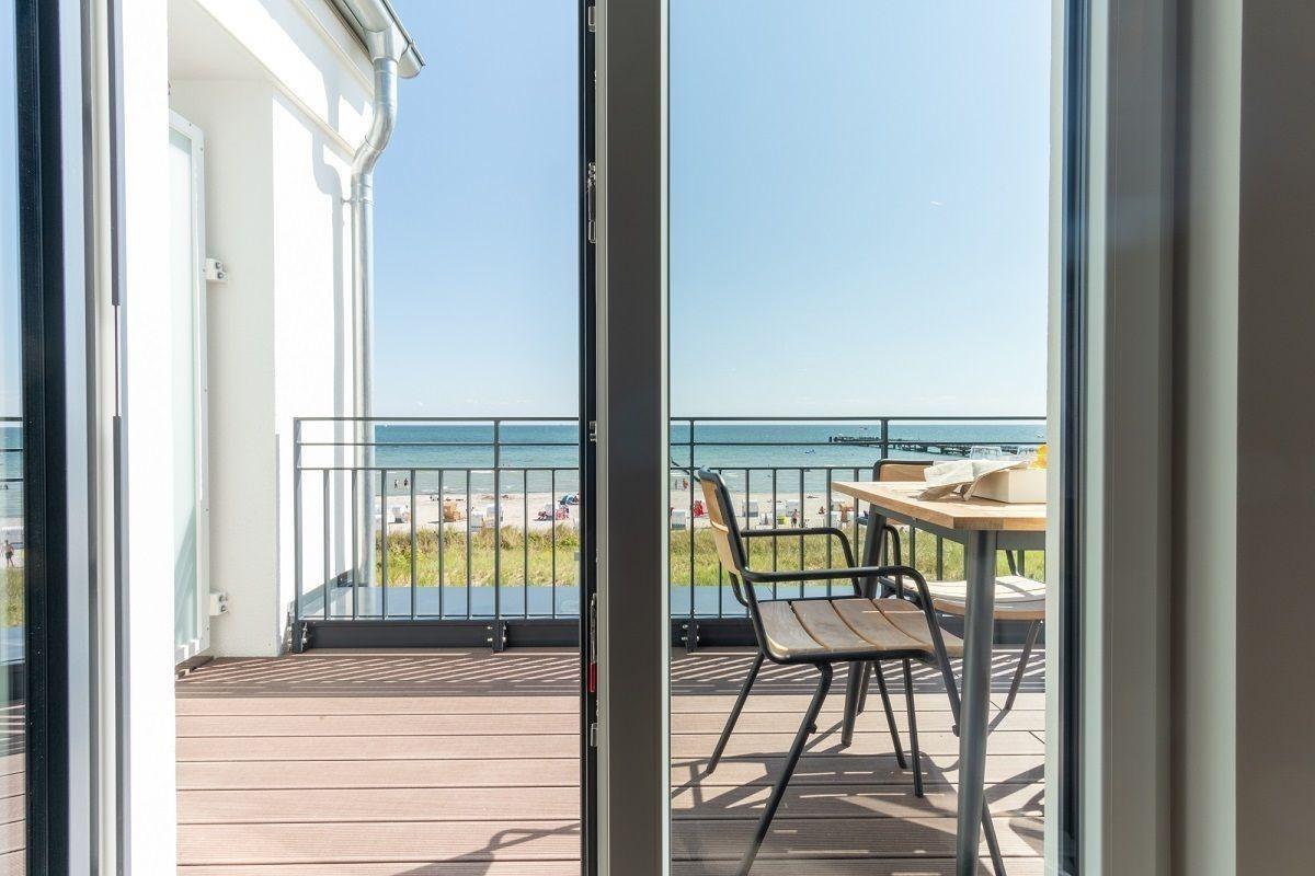 Sowohl vom Wohnzimmer als auch vom Schlafzimmer aus gelangen Sie auf den großen Süd-Balkon. Hier erwarten Sie nicht nur der einmalige Ostseeblick, sondern auch eine Outdoor Sitzgruppe- selbstverständlich für 3 Personen; sowie 2 Deckchairs mit Tisch und ein Sonnenschirm sind ebenfalls vorhanden.