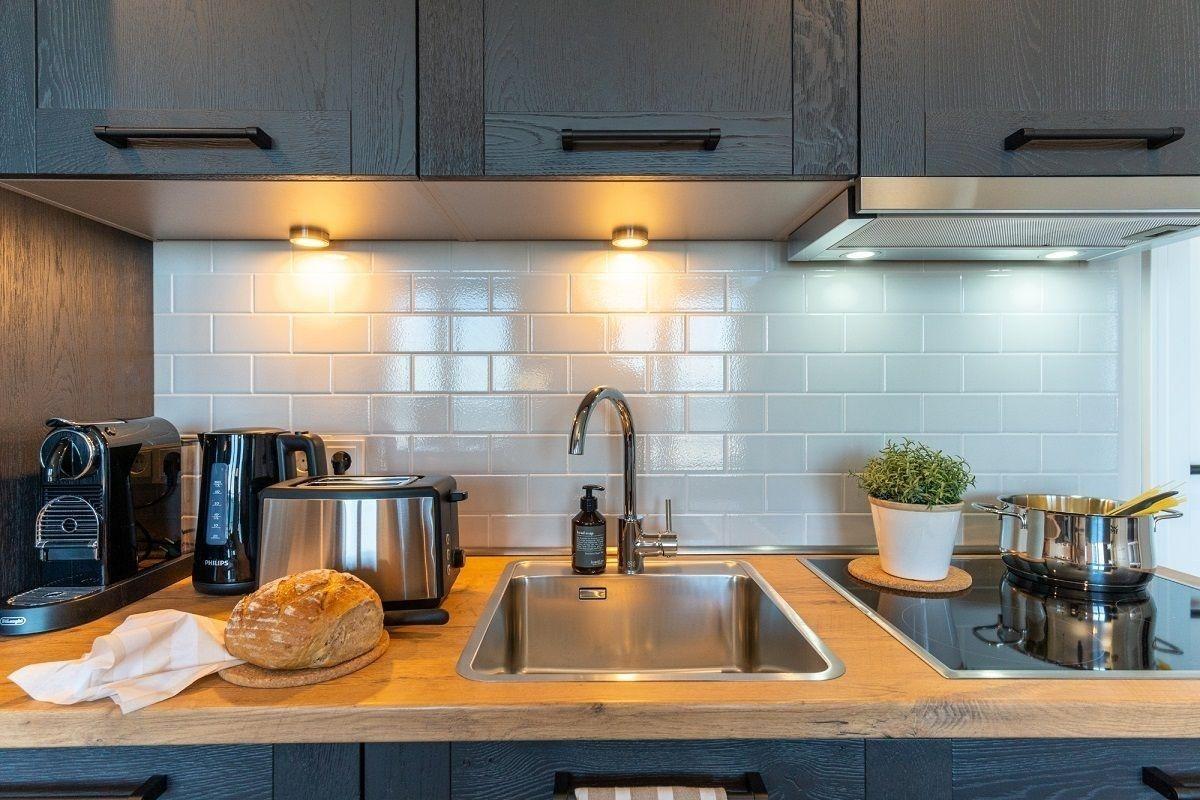 Die angrenzende offene Küche ist mit allen Annehmlichkeiten voll ausgestattet. Für Kaffeeliebhaber steht eine Nesspressomaschine zur Verfügung. Das Badezimmer ist mit einer ebenerdigen Dusche mit Glastrennwand ausgestattet. Das besondere Highlight ist die wohnungseigene Sauna - hier lässt es sich auch an Schietwettertagen herrlich relaxen.