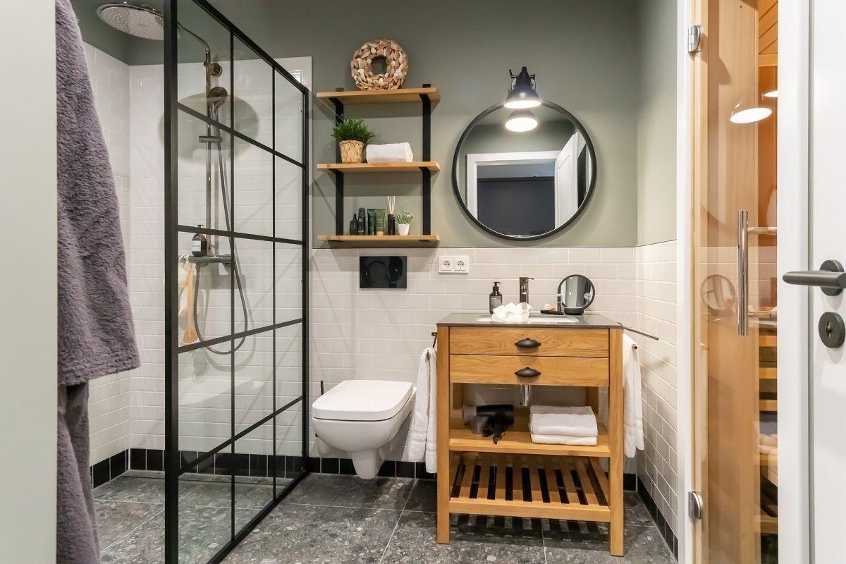Und ist das Wetter einmal wieder so richtig ungemütlich, lädt das Wellnessbad mit seiner eigenen Sauna zum Relaxen ein. Zudem verfügt das Bad über eine ebenerdige Dusche, einen Kosmetikspiegel und einen Handtuchheizkörper.