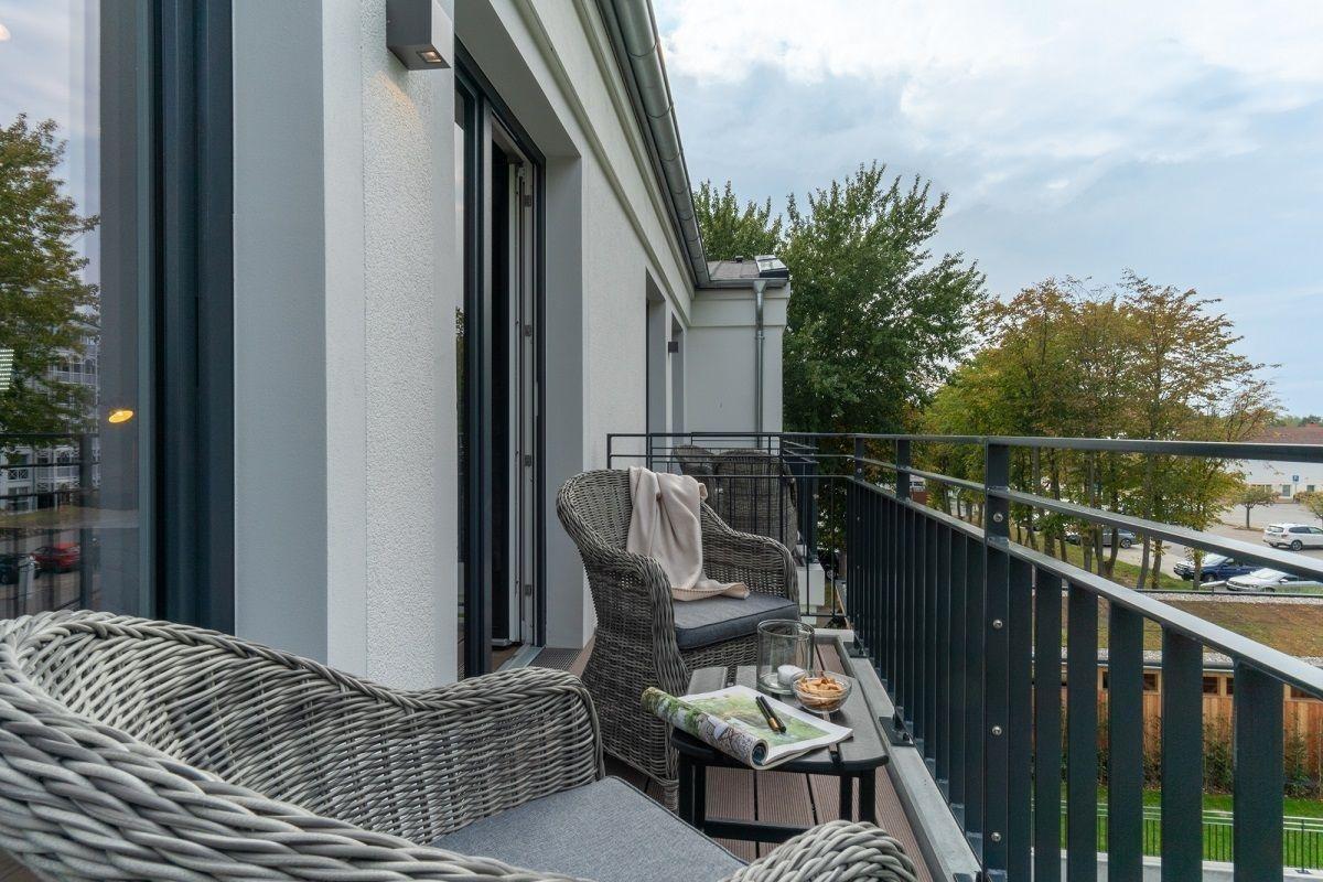 Der möblierte Balkon der Wohnung lädt jederzeit zum verweilen und entspannen ein. Zur Wohnung gehört ein eigener Tiefgaragenstellplatz (Nr. 14) im Haus.