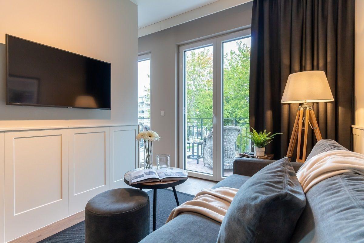 Der lichtdurchflutete Wohnbereich ist mit einer gemütlichen Sofaecke und einem Flatscreen-TV ausgestattet. Vom Wohnbereich optisch abgeteilt befindet sich das Schlafzimmer mit einem luxurösen Doppelbett (ca. 190*200cm). Der offene Küchenbereich ist mit allen wichtigen Küchengeräten, Essgeschirr, sowie Besteck ausgestattet. Außerdem stehen Ihnen noch ein Backofen, ein Geschirrspüler und eine Nespressomaschine zur Verfügung.