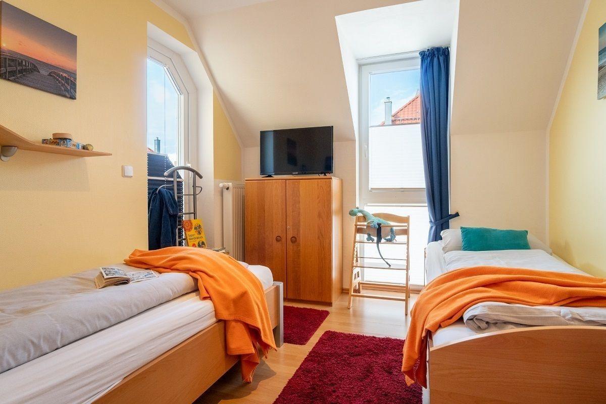 Die 83m²-Wohnung befindet sich in der dritten Etage in der Anlage "Strandpark" im Haus "Windrose". er lichtdurchflutete Wohnbereich ist mit einer gemütlichen Sofaecke, TV, Spielen, einem Kaminofen u.v.m. ausgestattet. Der offene Küchenbereich ist, für den Urlaubsbedarf, voll ausgestattet. Eine Kaffeemaschine gehört ebenso dazu, wie der Wasserkocher und ein Toaster. Geschirr und Besteck sind ausreichend vorhanden. Außerdem stehen Ihnen noch ein Backofen, Geschirrspüler und eine Mikrowelle zur Verfügung. Beide Schlafzimmer sind mit TVs, sowie Verdunklungsmöglichkeiten eingerichtet. Im großen Schlafzimmer steht Ihnen ein Doppelbett (ca. 180x200cm) zur Verfügung. Im Kinderzimmer erwarten Sie zwei Einzelbetten (ca. 90x200cm).