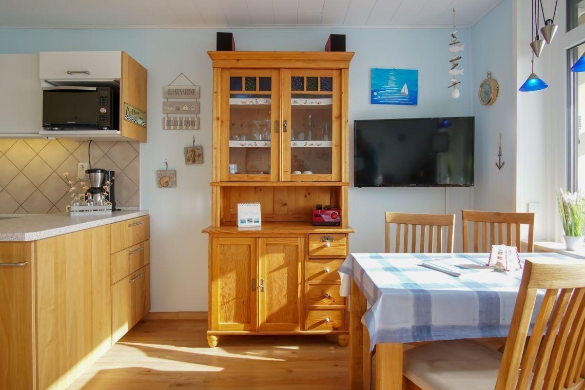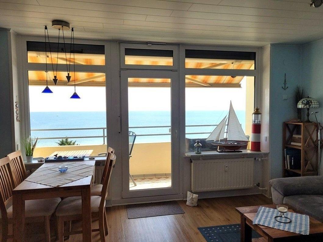 Vom Wohnzimmer aus gelangen Sie auf den Südbalkon mit herrlichem Meerblick. Der offene Küchenbereich ist, für den Urlaubsbedarf, voll ausgestattet.