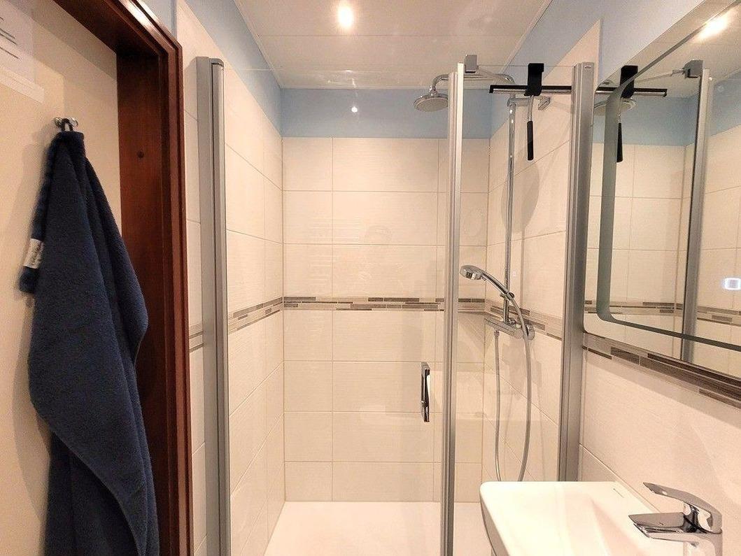 Die gemütliche 47m²-Wohnung befindet sich in der achten Etage verfügt über einen hellen Wohnbereich mit einem gemütlichen Sofa, Flatscreen-TV und einer Essecke für vier Personen. Vom Wohnzimmer aus gelangen Sie auf den Südbalkon mit herrlichem Merblick. Der offene Küchenbereich ist, für den Urlaubsbedarf, voll ausgestattet. Eine Kaffeemaschine gehört ebenso dazu, wie der Wasserkocher und ein Toaster. Geschirr und Besteck sind ausreichend vorhanden. Das Appartement verfügt über zwei separates Schlafzimmer: im Elternschlafzimmer wartet ein bequemes Doppelbett (ca. 160*200). Das Kinderzimmer hält ein kleines Doppelbett (ca. 120*200cm) vor. Die beiden Zimmer verfügen über Oberlichter, die sehr gut belichtet werden und die über eine Kurbel zum Lüften geöffnet werden können.