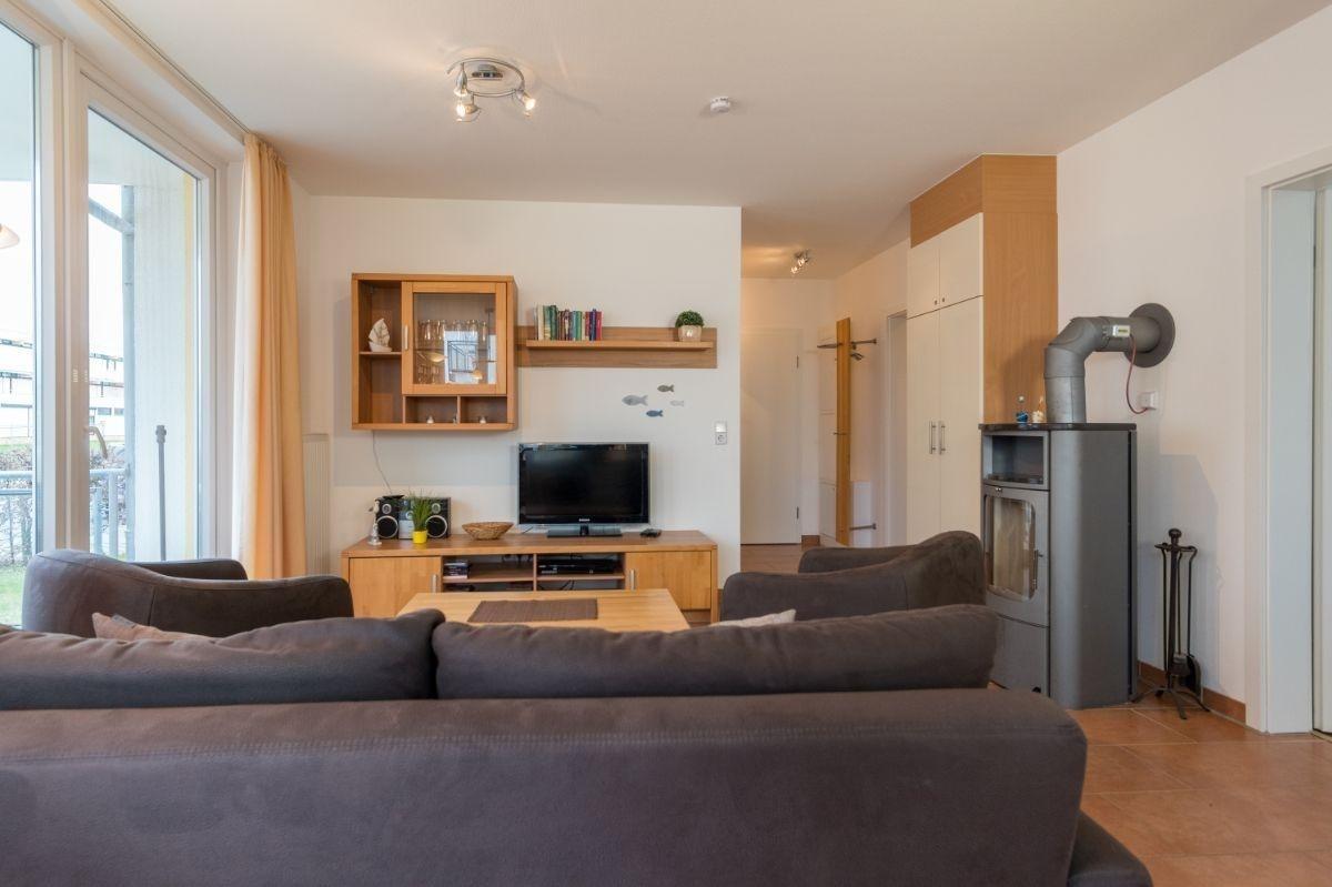 Die Wohnung verfügt über einen großzügigen Wohn- und Essbereich. Es gibt einen Fernsher sowie eine Lautsprecheranlage. Die große Küche lässt keine Wünsche offen. Außerdem gibt es einen wohlig warmen Kamin spwie zwei seperate Schlafzimmer und ein Duschbad mit Sauna.