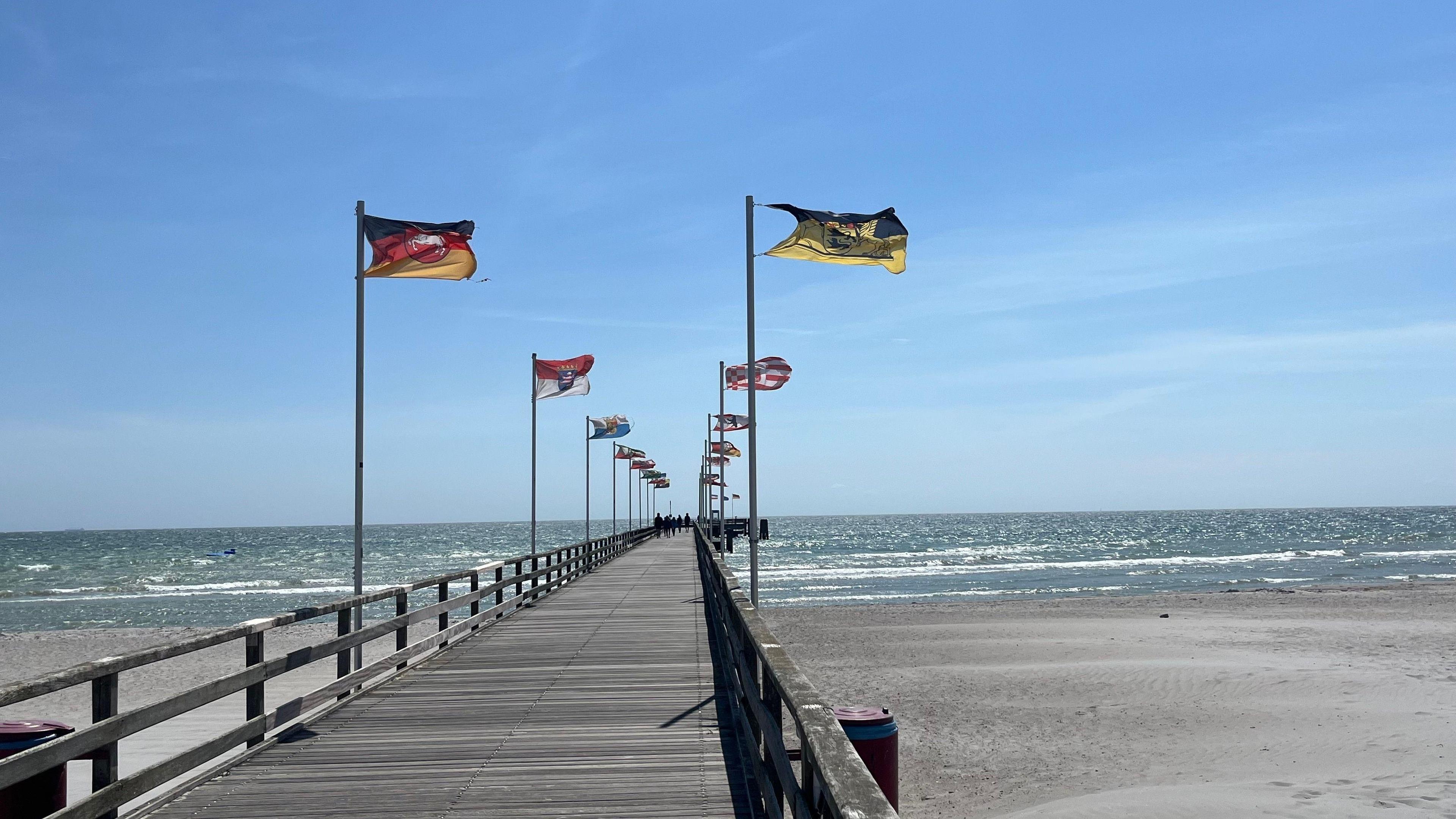 Großer Südbalkon mit grandiosem Meerblick bis zum Horizont. Auf der rechten Seite bis zur Seebrücke/Hafen. Die Sonne scheint bis zum Nachmittag auf den Balkon.