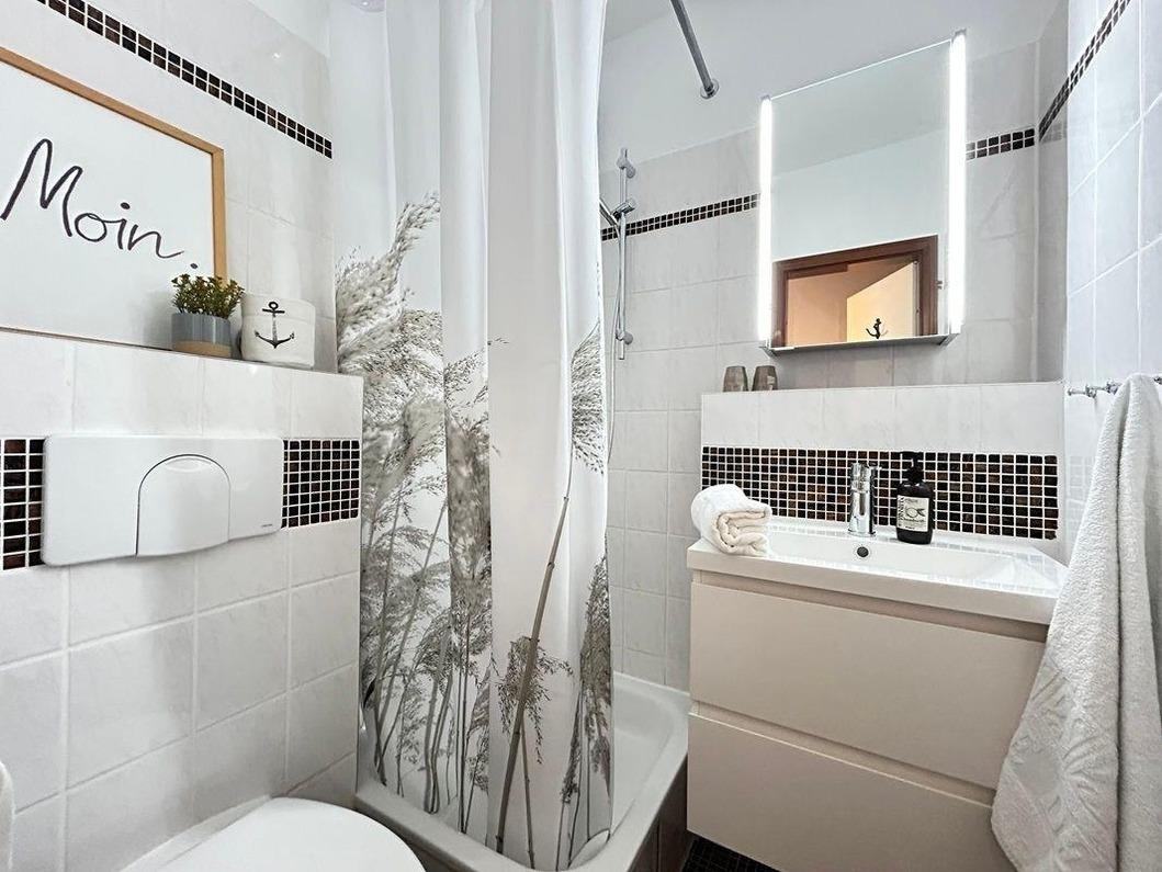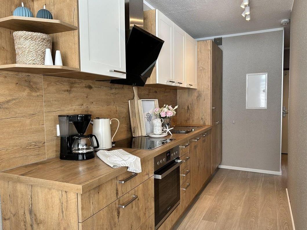 Sie verfügt über drei Zimmer auf ca. 49m² - aufgeteilt auf zwei Schlafzimmer, ein Duschbad und den lichtdurchfluteten Wohn- und Essbereich, der angrenzende offene Küchenbereich ist für den Urlaubsbedarf, voll ausgestattet.