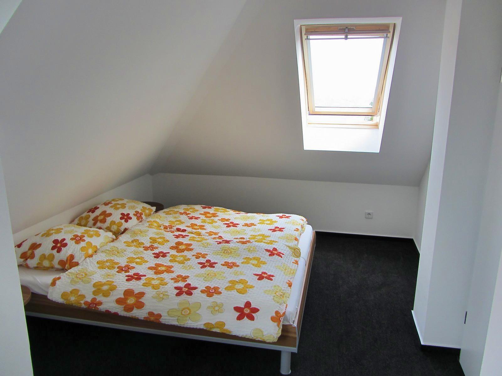 Das Schlafzimmer bietet neben einem 1,60 x 2,00m breiten Bett einen zusätzlichen TV und ausreichend Stauraum. Ein Babyreisebett steht Ihnen ebenfalls zur Verfügung. Daneben gibt es im oberen Dachzimmer ein weiteres Bett.