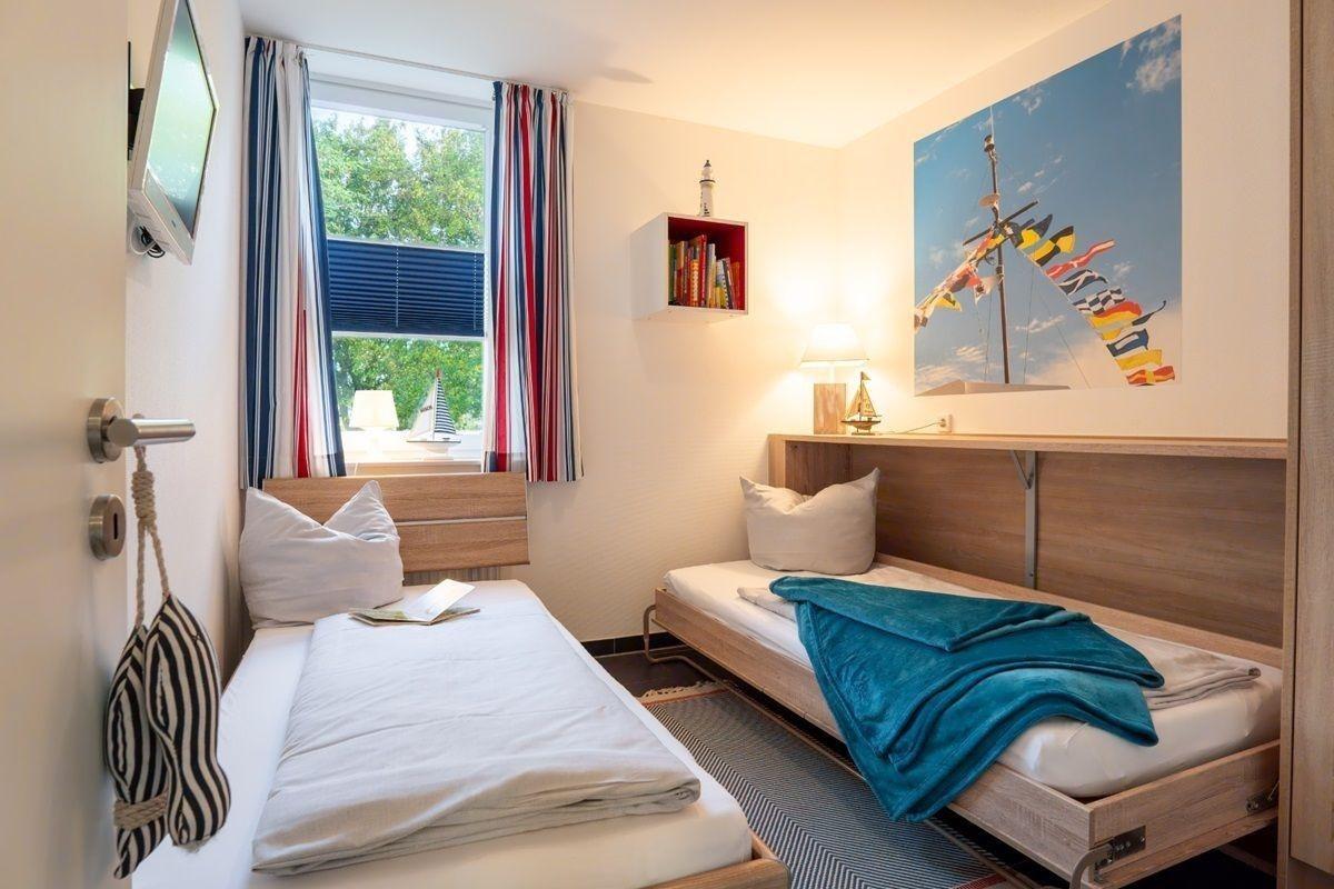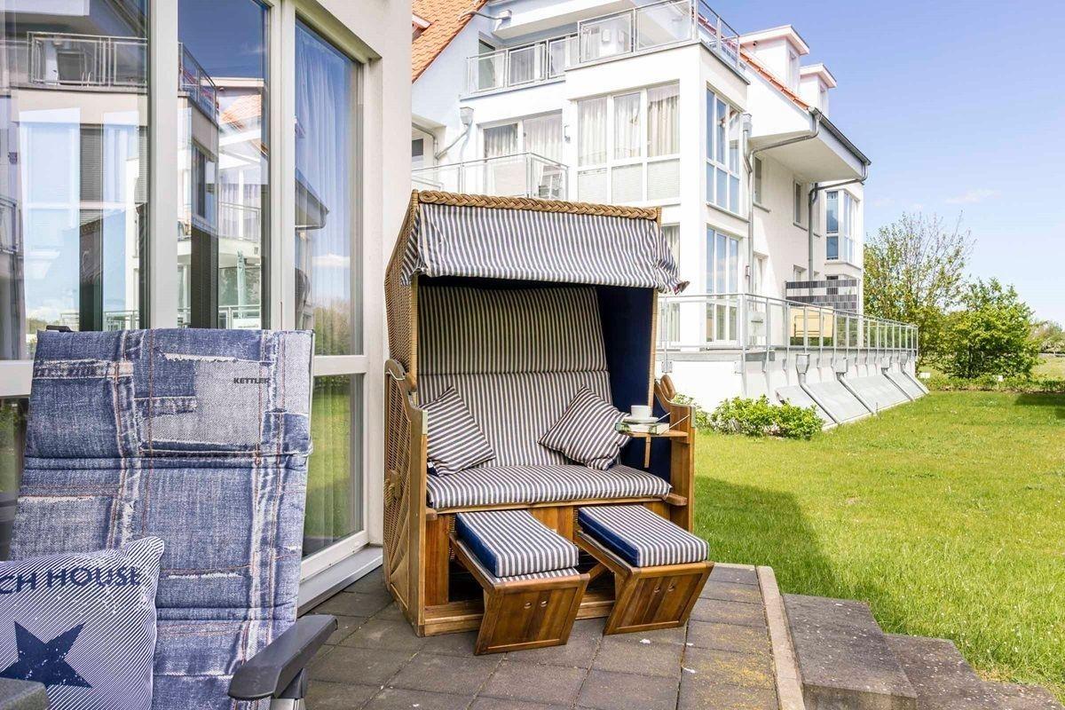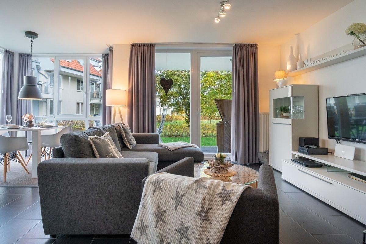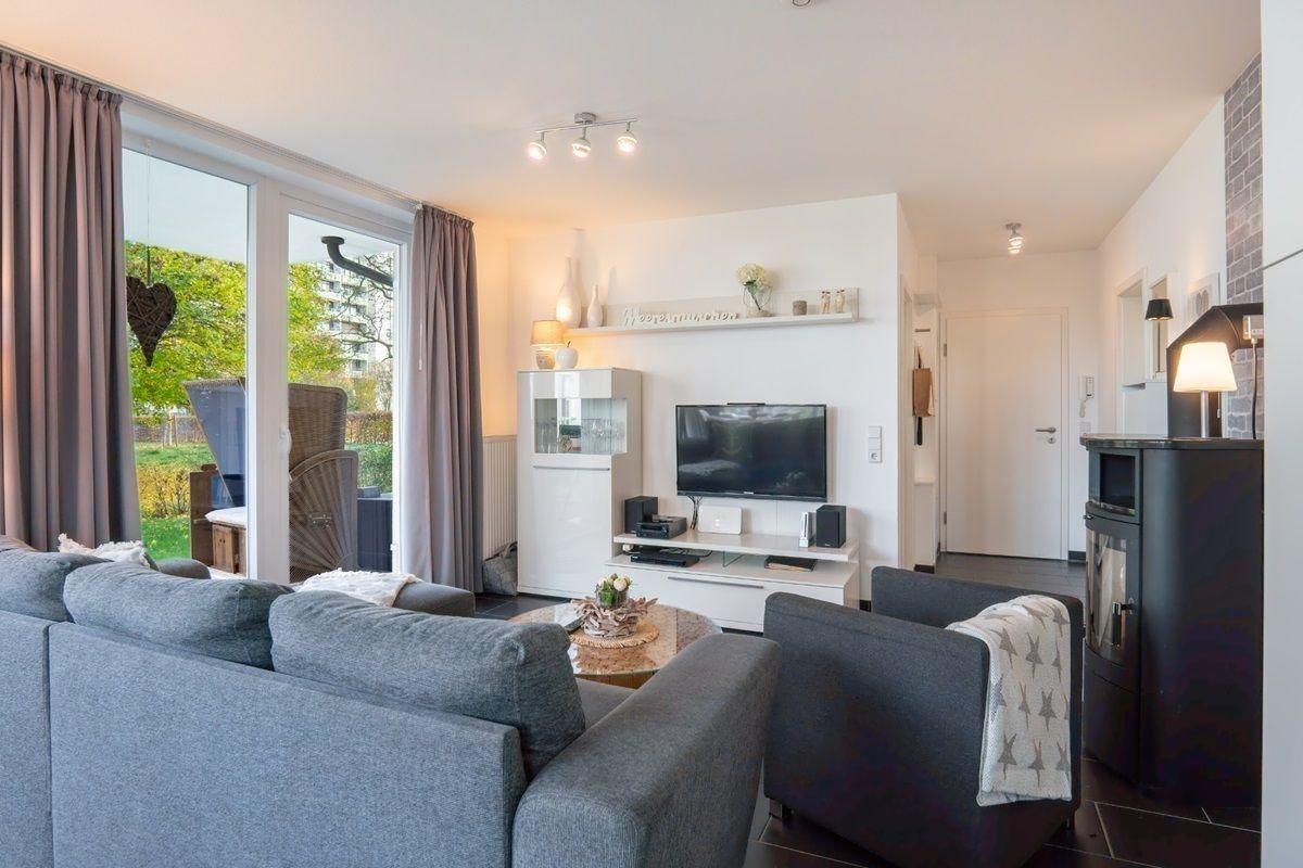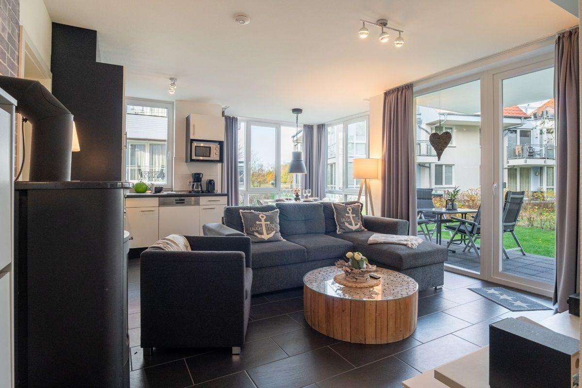 Die gemütliche Wohnung verfügt über einen lichtdurchfluteten Wohnbereich - aufgeteilt in eine TV-Ecke mit Sofa und Kaminofen, Essecke am Fenster und einer Küchenzeile. Vom Wohnbereich aus gelangt man auf die Terrasse mit Nord-Ost-Ausrichtung - man kann die Ostsee schon riechen. Das große Schlafzimmer ist mit einem Boxspringbett, Kleiderschrank, sowie einem eigenen TV ausgestattet. Im zweiten Schlafzimmer (Kinderzimmer) stehen ein Einzelbett und ein Schrankbett zur Verfügung, hier befindet sich der dritte Fernseher der Wohnung. Für Wellnessfans ist das Badezimmer bestens geeignet: Sauna und eine große Wellnessbadewanne gehören neben der Dusche ebenfalls zur Ausstattung.