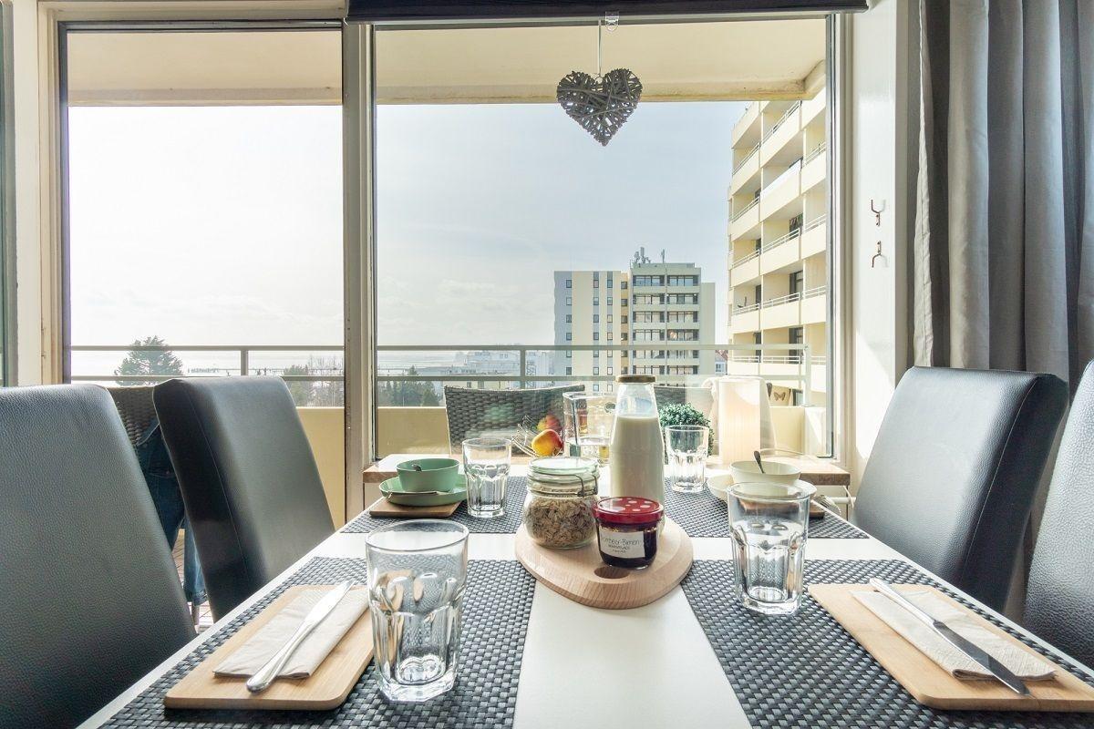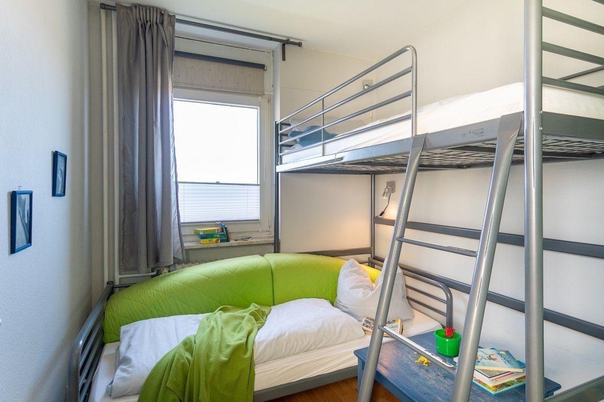 Die gemütliche 54m²-Wohnung befindet sich in der vierten Etage verfügt über einen hellen Wohnbereich mit einem gemütlichen Sofa, Flatscreen-TV und einer Essecke für vier Personen. Vom Wohnzimmer aus gelangen Sie auf den Westbalkon mit herrlichem Meerblick. Der offene Küchenbereich ist, für den Urlaubsbedarf, voll ausgestattet. Eine Kaffeemaschine gehört ebenso dazu, wie der Wasserkocher und ein Toaster. Geschirr und Besteck sind ausreichend vorhanden. Die Schlafgelegenheiten teilen Sich auf zwei Schlafzimmer auf - eins ist mit einem Doppelbett und TV ausgestattet und das Kinderzimmer hält ein Etagenbett vor.