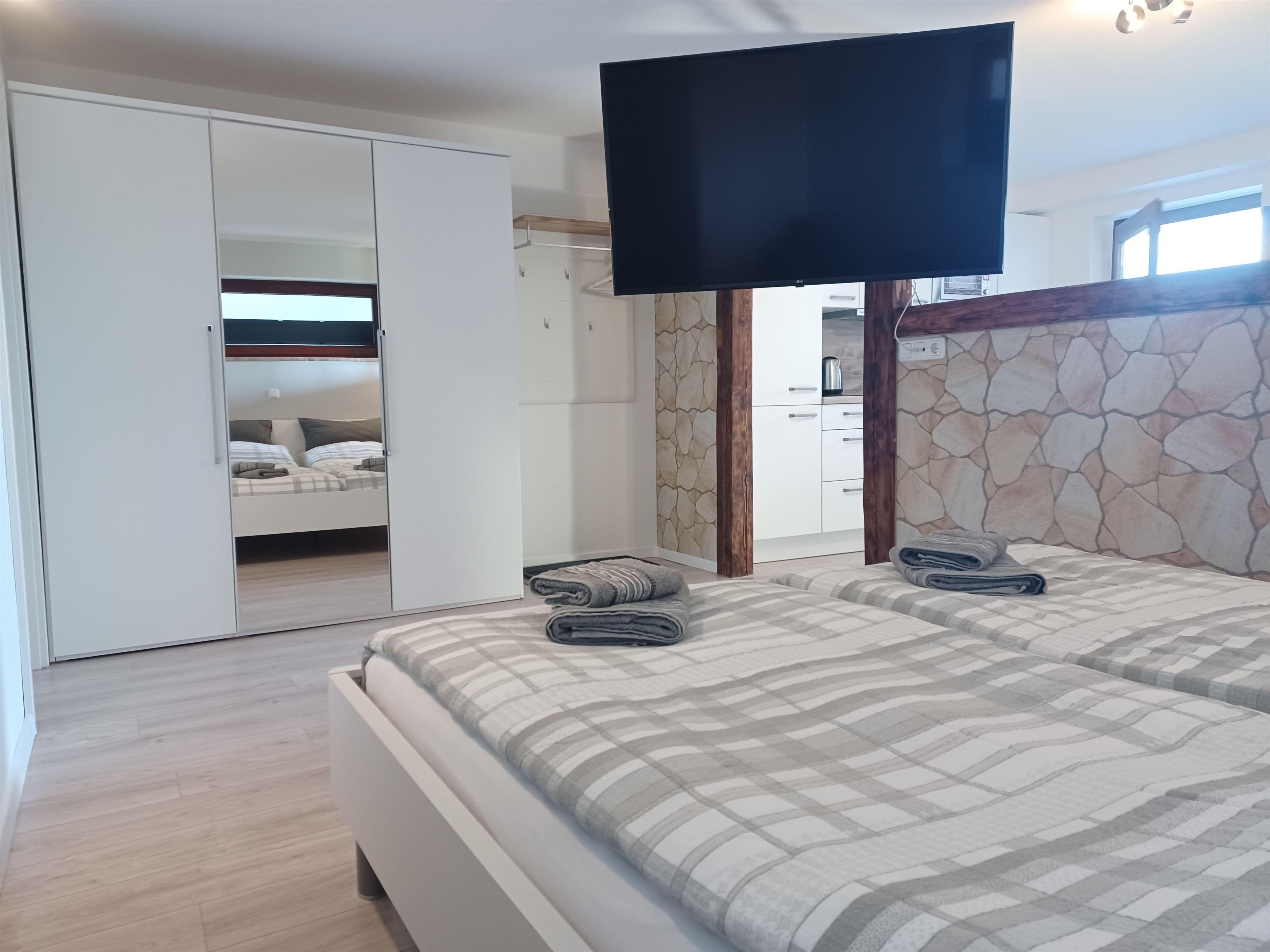 Wer seinen Abend lieber entspannt bei einem Glas Wein und einem Tatort oder Blockbuster ausklingen lassen möchte, der kann dies auf der gemütlichen Couch im Wohnbereich oder auch vom Bett aus im Schlafbereich dank des großen schwenkbaren 55-Zoll TVs tun. Der Schlafbereich ist weiterhin mit einem 1,80 x 2,00 m großen Doppelbett sowie einem geräumigen Kleiderschrank und einer Garderobe ausgestattet.