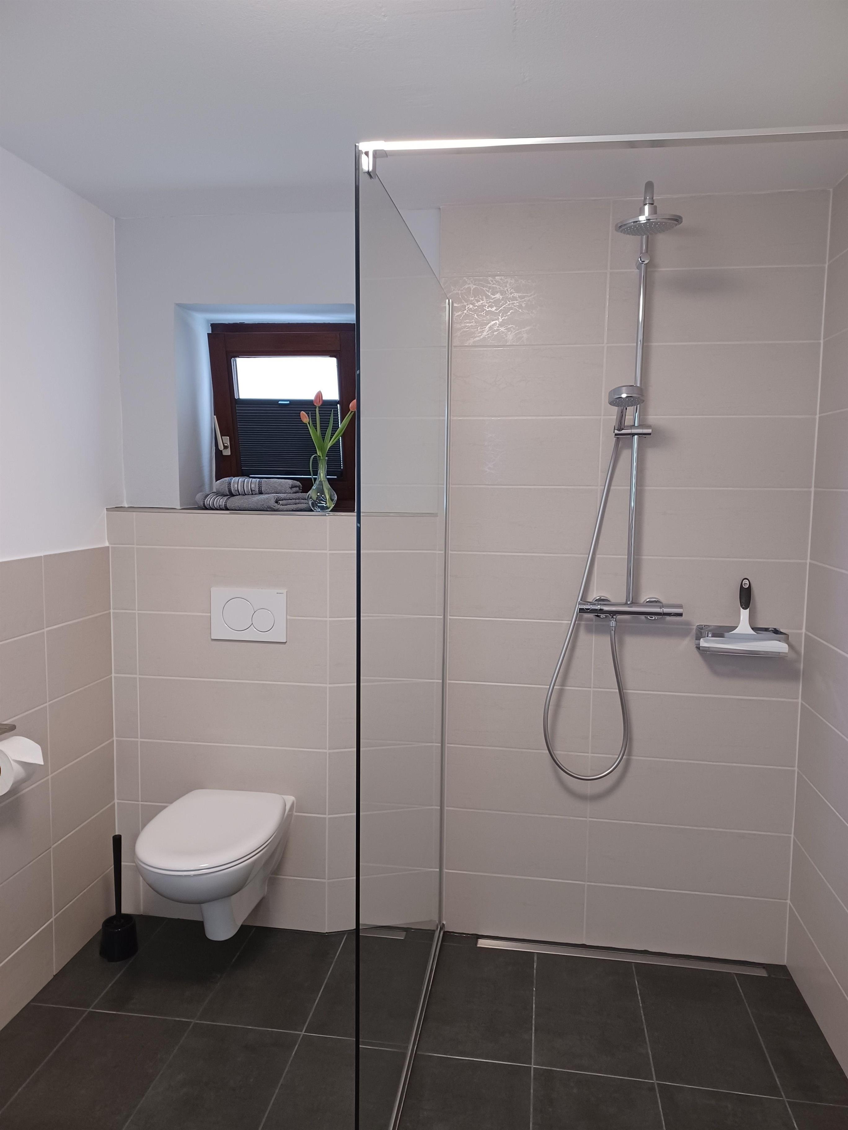 Das Badezimmer ist eine moderne Wohlfühloase mit einer großen begehbaren Regendusche (1,10 x 1,20 m).