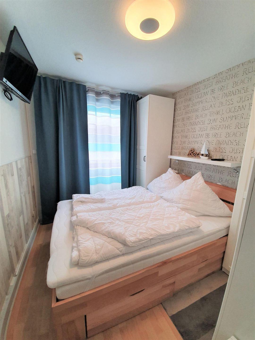 Im Schlafzimmer erwartet Sie ein geräumiges Doppelbett und Schränke für das Verstauen Ihrer Urlaubsgarderobe. An der Wand des Schlafzimmers ist ein zweiter Fernseher befestigt.