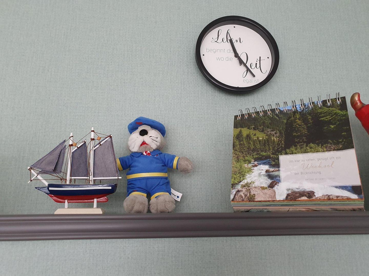 Auf dem Flur finden Sie eine Garderobe und einen Schuhschrank vor. Einige Bücher und Spiele liegen für Sie bereit. Liebevoll ausgesuchte Details runden das Bild ab.