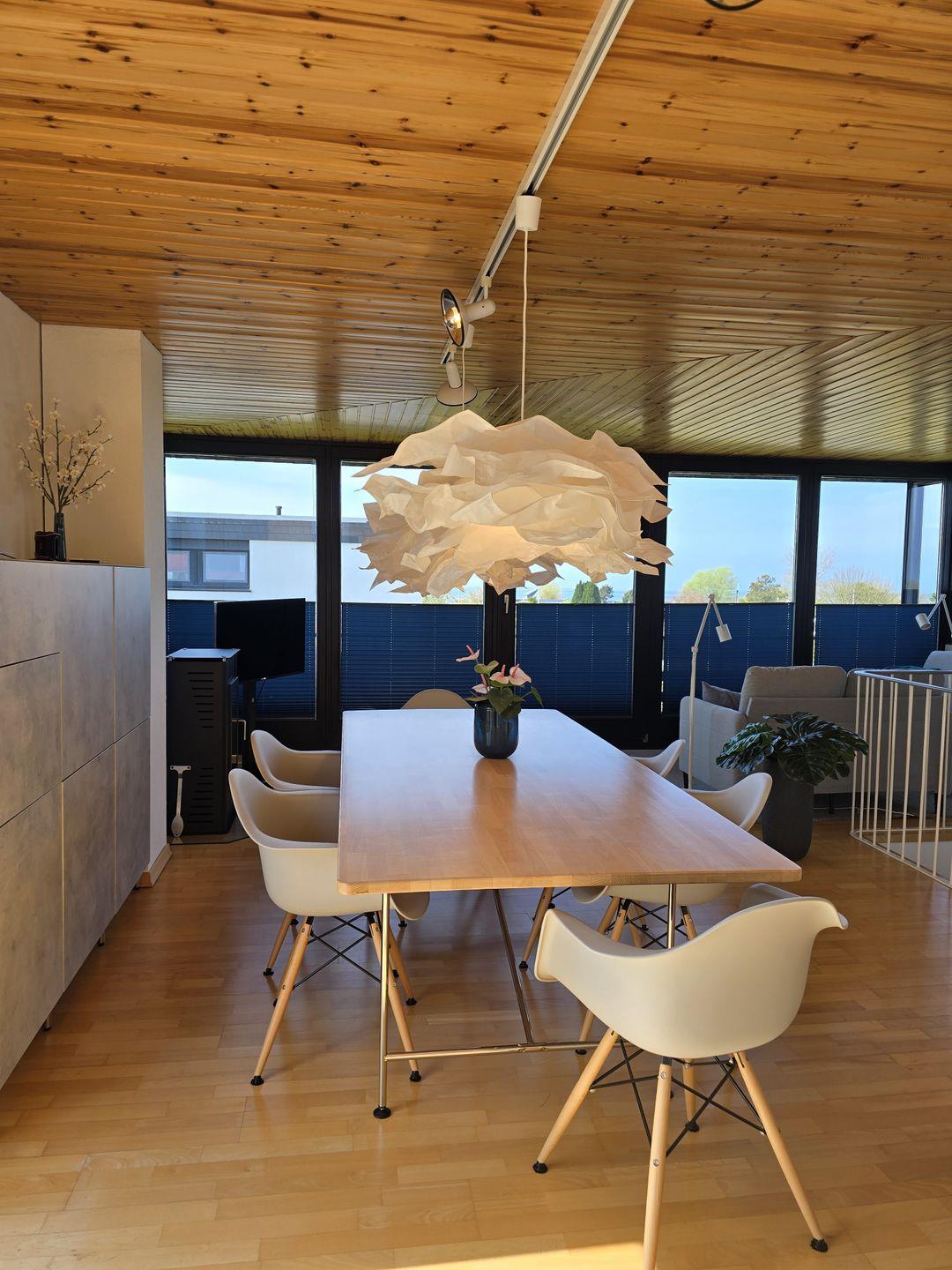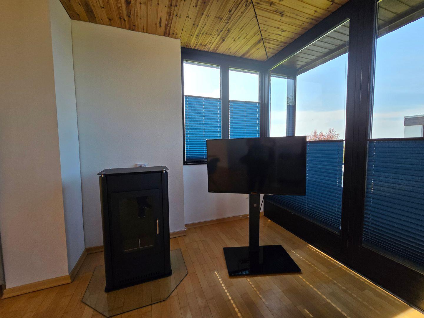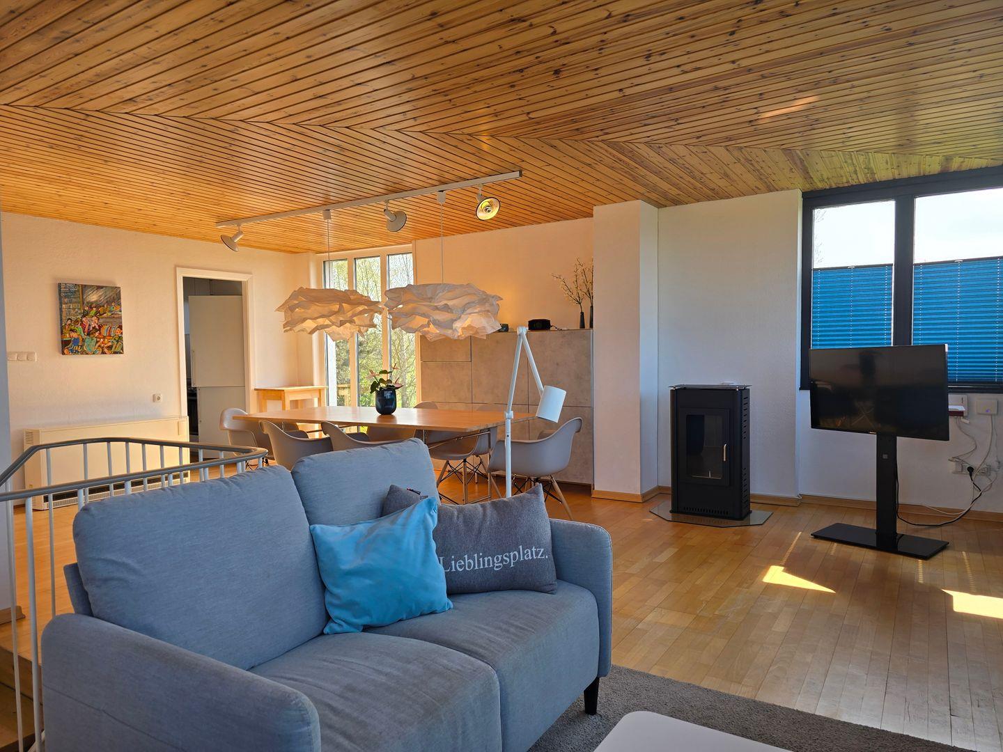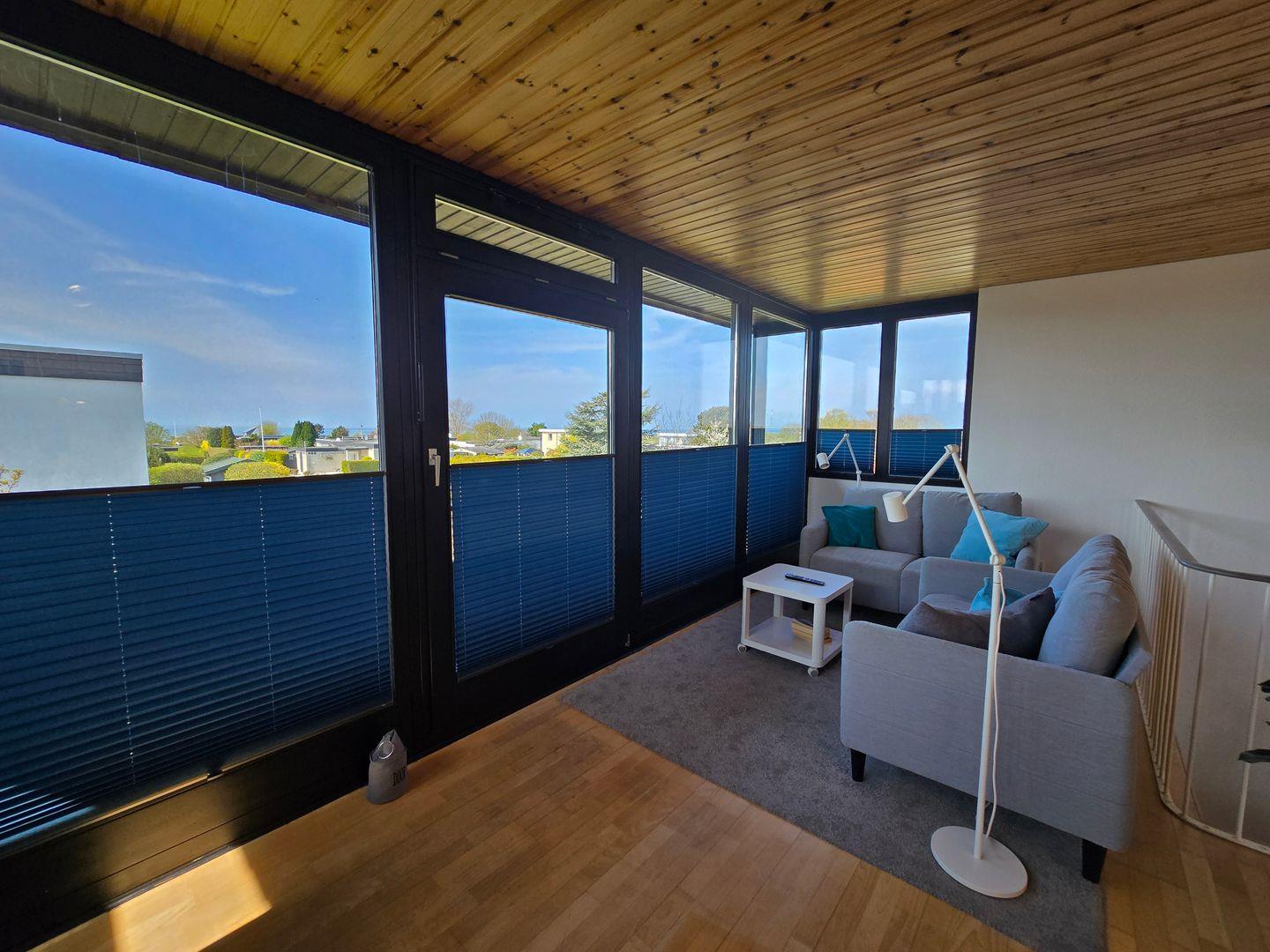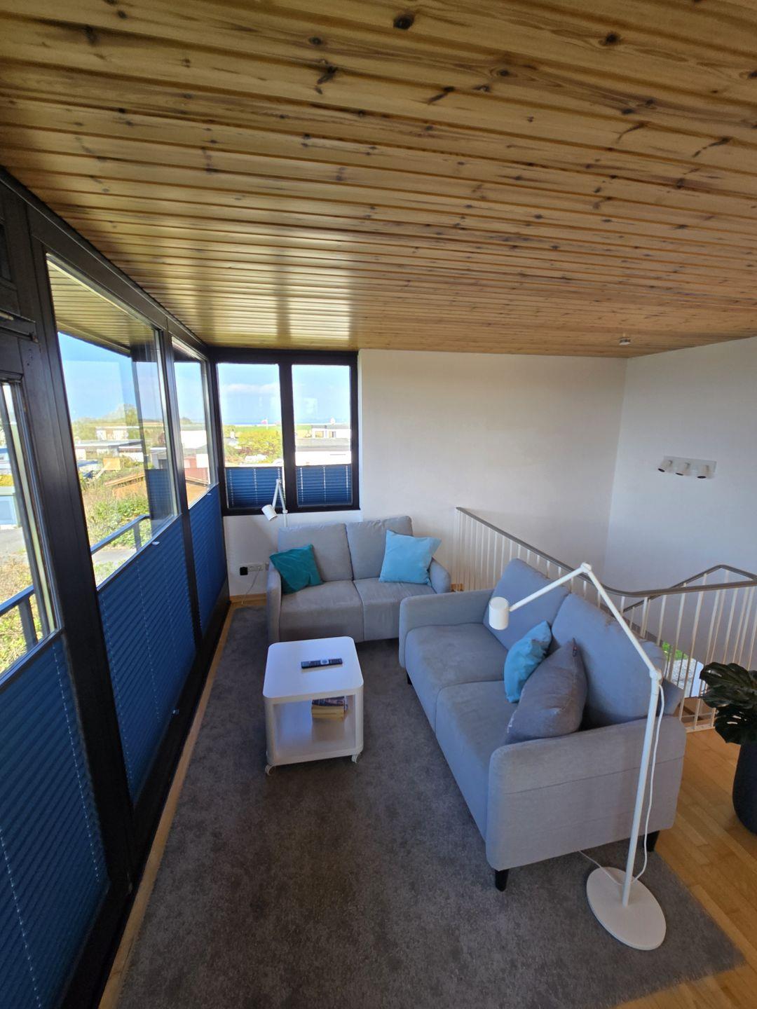 Von dort aus gelangen Sie über die Treppe in den großzügigen, lichtdurchfluteten Wohn- und Essraum (30qm) im ersten Stock. Der große Esstisch sowie zwei 2-er-Sofa laden geradezu zum Verweilen ein - genießen Sie von hier den einmaligen Panoramablick über die Ostsee nach Heiligenhafen und auf den Fehmarnsund bis hinüber zur Insel Fehmarn. Die große Glasfront lässt sich durchgängig durch hochwertige Luxaflex Plissees bei intensiver Sonneneinstrahlung abschirmen. Zu Ihrer Unterhaltung steht Ihnen bei Bedarf hier eines der beiden TV-Geräte zur Verfügung. Der Akku-Bluetooth-Lautsprecher ist portabel und auch im Außenbereich verwendbar und lässt keine Langeweile aufkommen.