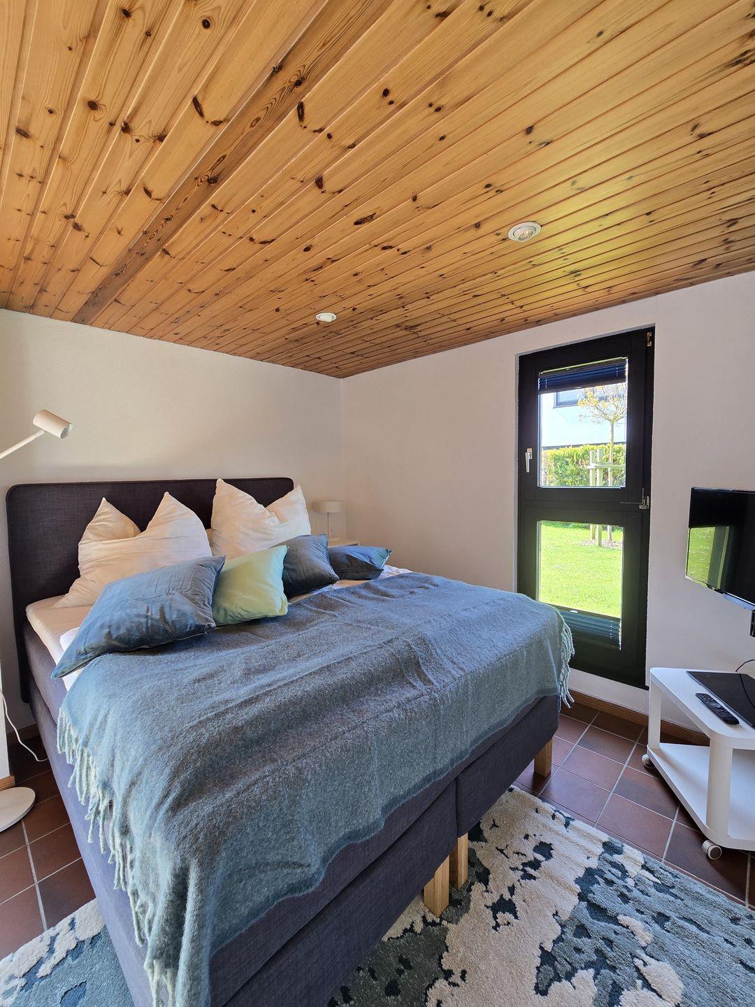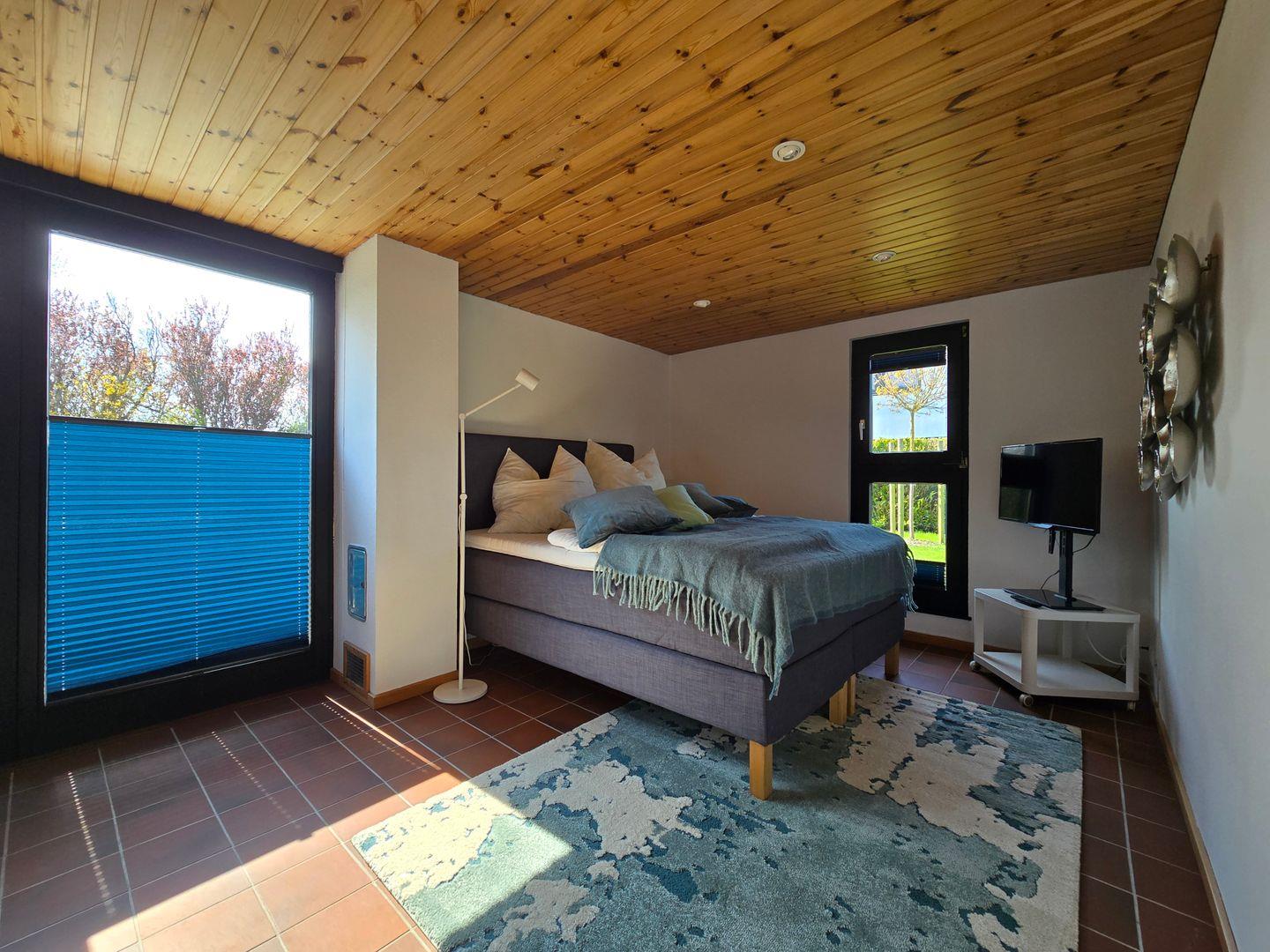In der unteren Etage erwartet Sie ein weiteres Highlight: Hier befindet sich das große Schlafzimmer mit direktem Zugang zur Terrasse und zum großen Garten. Es ist mit einem QueenSize-Boxspingbett (160*200) ausgestattet. auch dieses Bett zeichnet sich durch hohen modernen Komfort aus. In diesem Bereich befindet sich ein weiteres Fernsehgerät (Sat-Antenne).