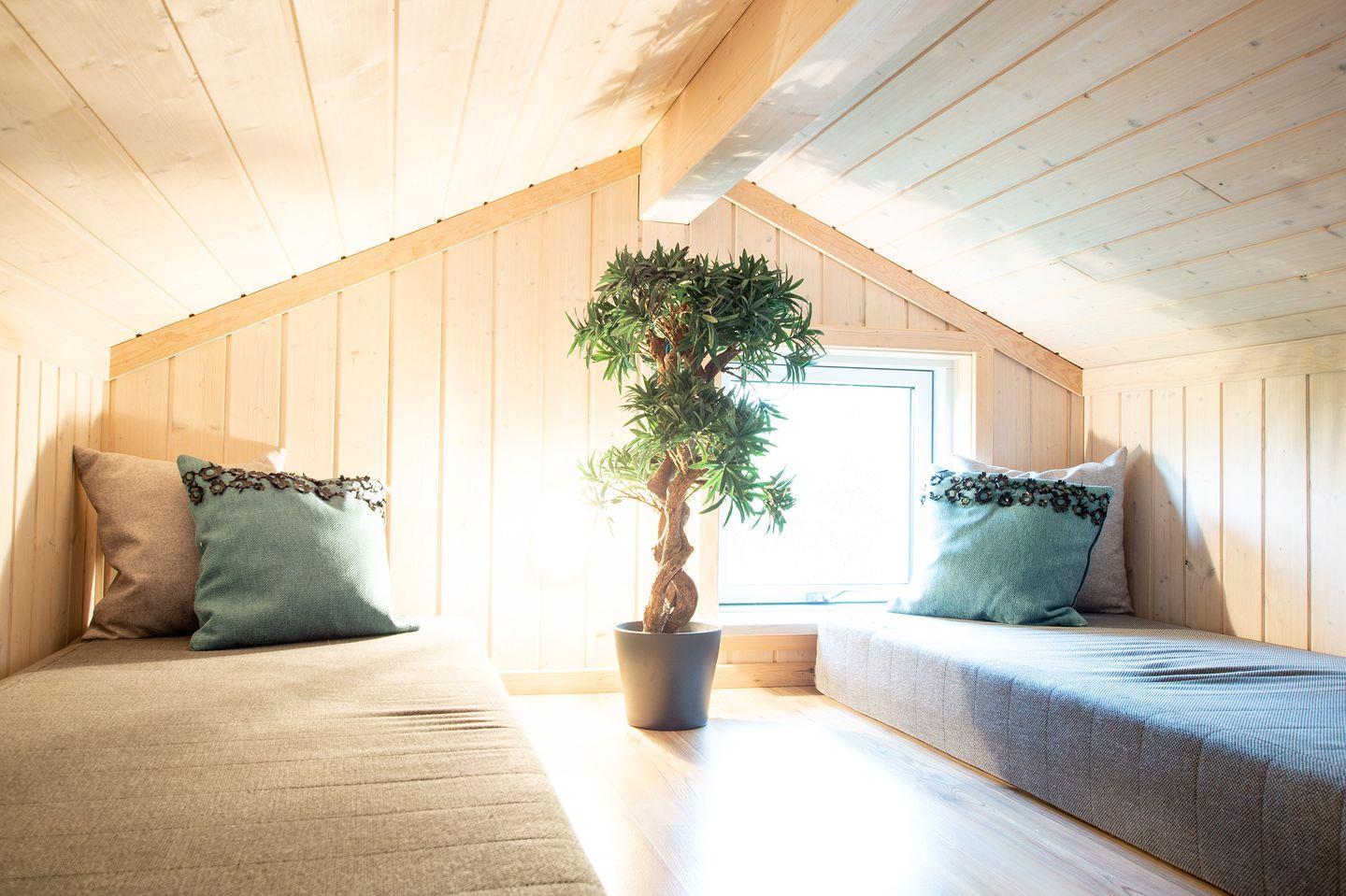 Die zwei Bereiche mit insgesamt 4 Schlafzimmern sind räumlich voneinander getrennt und auf gegenüberliegenden Seiten des Hauses platziert. Jeder Schlafbereich beinhaltet jeweils ein Schlafzimmer mit Doppelbett und ein Schlafzimmer mit zwei Einzelbetten. Über einem der Schlafbereiche gibt es zwei extra Schlafplätze auf dem Hems, eine Art Schlafboden. Hier tummeln gerne die Kinder. Zu beiden Schlafbereichen gehört jeweils ein Bad. Das große Badezimmer ist mit Whirlpool, Sauna und Dusche ausgestattet und das kleinere Bad mit Dusche. Ein Kinderbett und ein Kinderhochstuhl befinden sich im Haus.