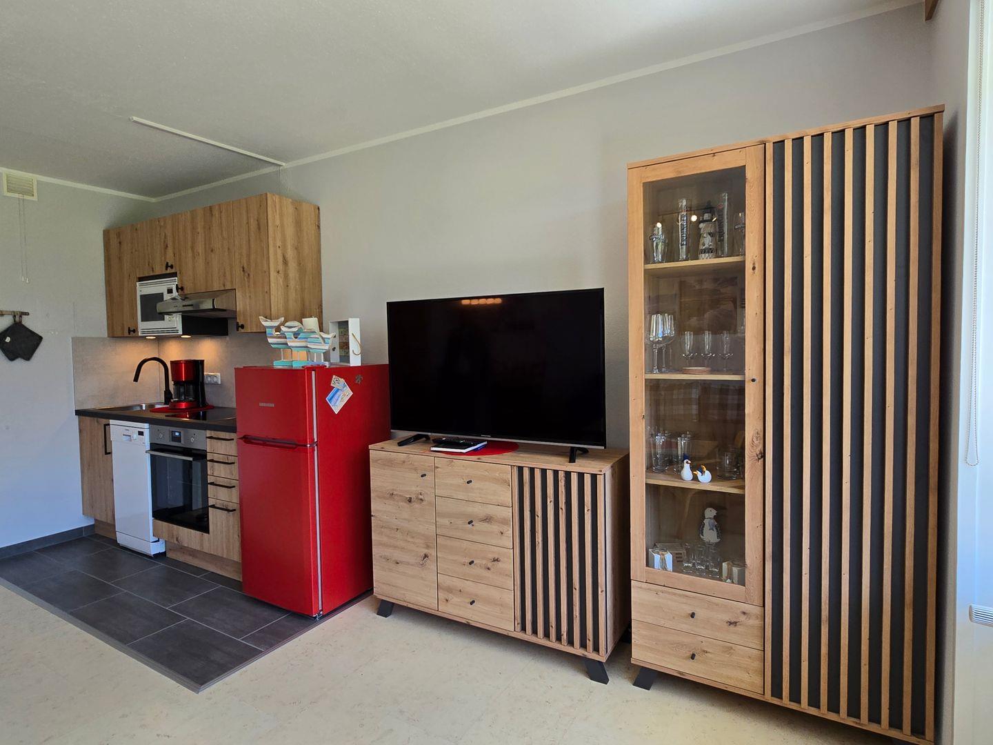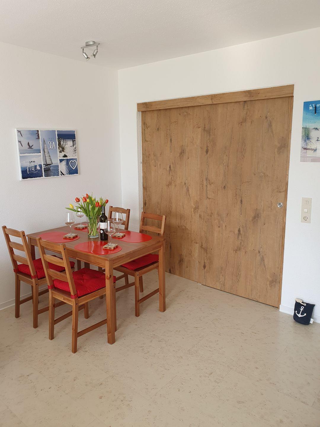In der zum Wohnzimmer offenen Küchenzeile stehen Ihnen Backofen, Induktionskochfeld, Microwelle, Toaster, ein großer Kühlschrank mit separatem Gefrierfach sowie alle notwendigen Kochutensilien zum gemeinsamen Kochen und Essen in der Ferienunterkunft zur Verfügung. Am Esstisch findet sich Platz für 4 Personen für gemeinsame Mahlzeiten und gesellige Unterhaltungen.