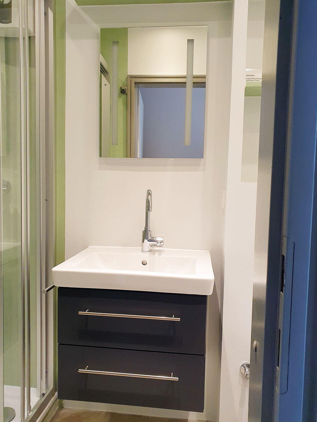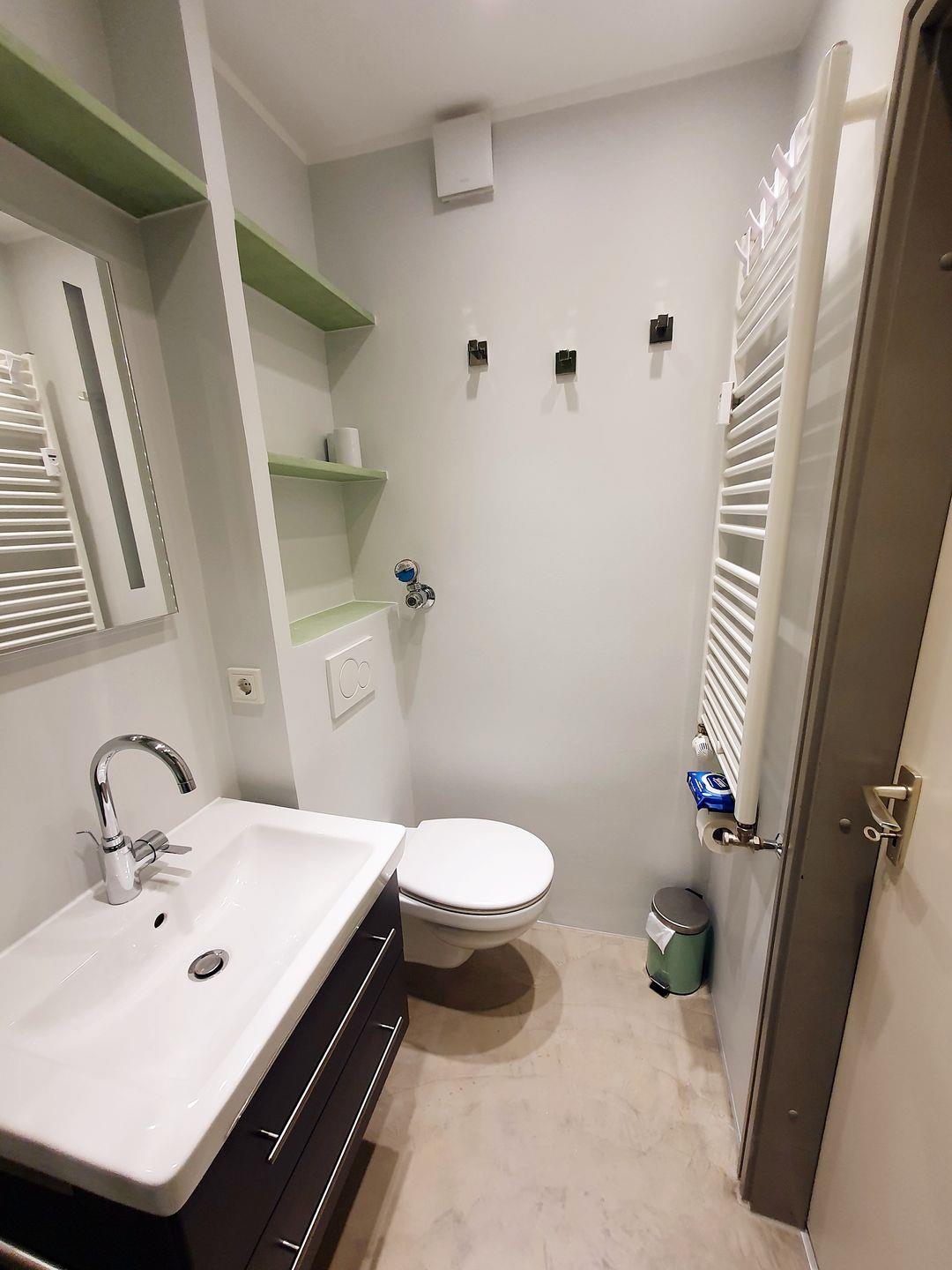 Im innenliegenden Badezimmer der Wohnung finden Sie eine Dusche mit flachem Einstieg sowie schiebbaren Duschwänden vor. Die integrierte Spiegelbeleuchtung und die natürliche Gestaltung verleihen dem Badezimmer eine harmonische Note.