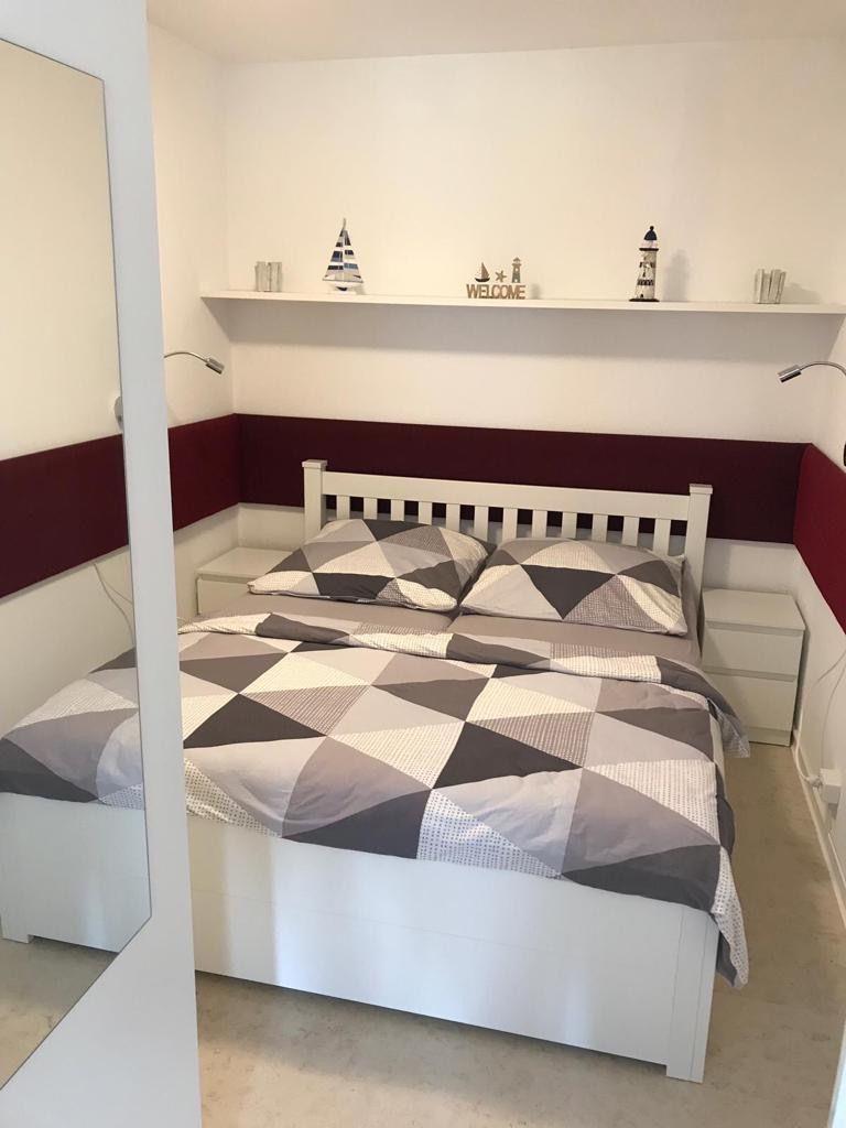 Das kuschelige, durch eine Falttür vom Wohnzimmer abgetrennte Schlafzimmer bietet neben dem Doppelbett (2*80*200 cm) zwei Nachttische sowie einen großzügigen Kleiderschrank mit Ganzkörperspiegel in dem sowohl Ihre Urlaubsgarderode als auch Koffer und Taschen Platz finden. Gegen zerknitterte Wäsche aus dem Koffer bieten Bügeleisen und Bügelbrett Abhilfe.