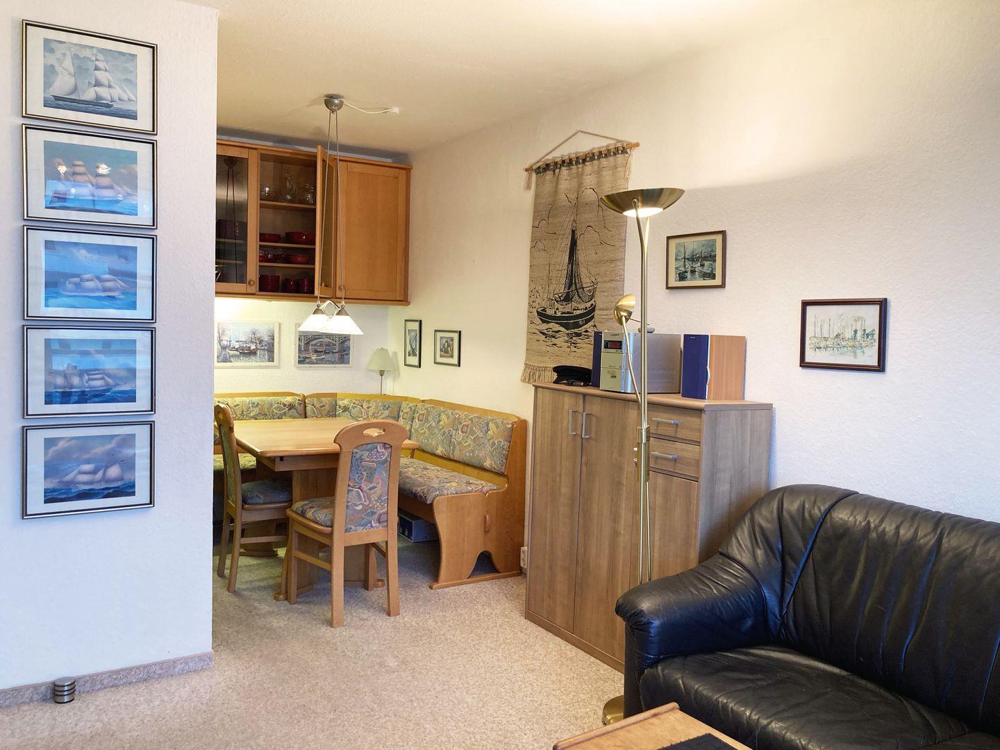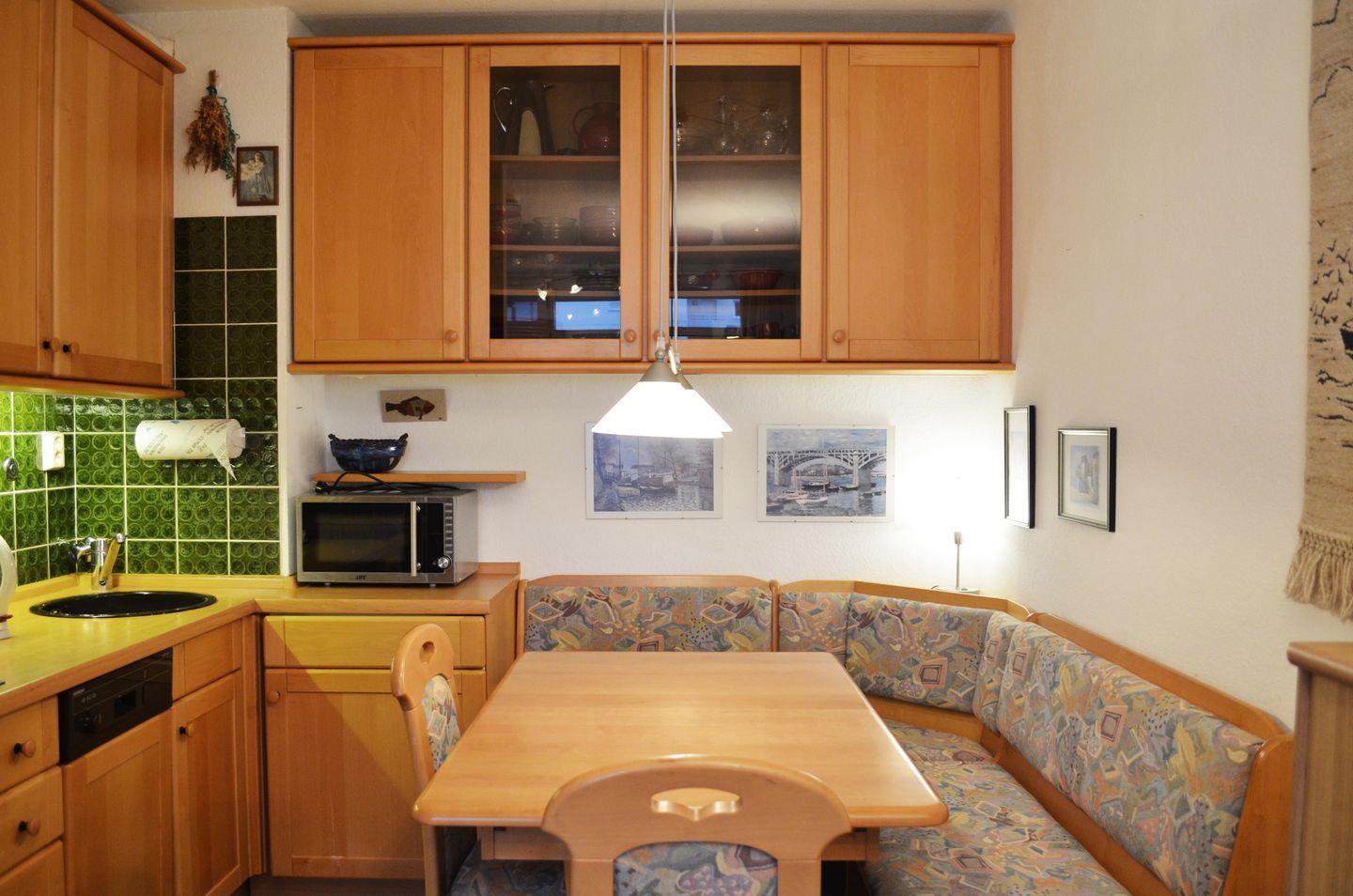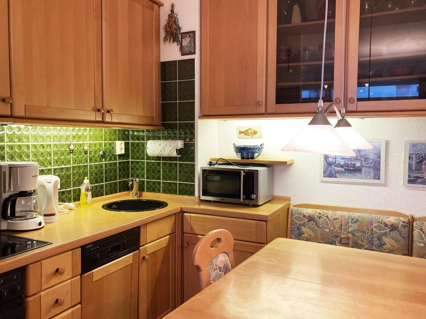 Das Appartement verfügt über einen Flur, ein kleines Duschbad, ein separates Schlafzimmer mit großer Fensterfront sowie ein kombiniertes Wohn-/Esszimmer mit ausgestatteter Einbauküche: Backofen, 4-Feld-Ceranherd und Microwelle stehen Ihnen zum Zubereiten Ihrer Urlaubsmahlzeiten zur Verfügung. Am großen Esstisch mit Essecke finden auch Gäste Platz.