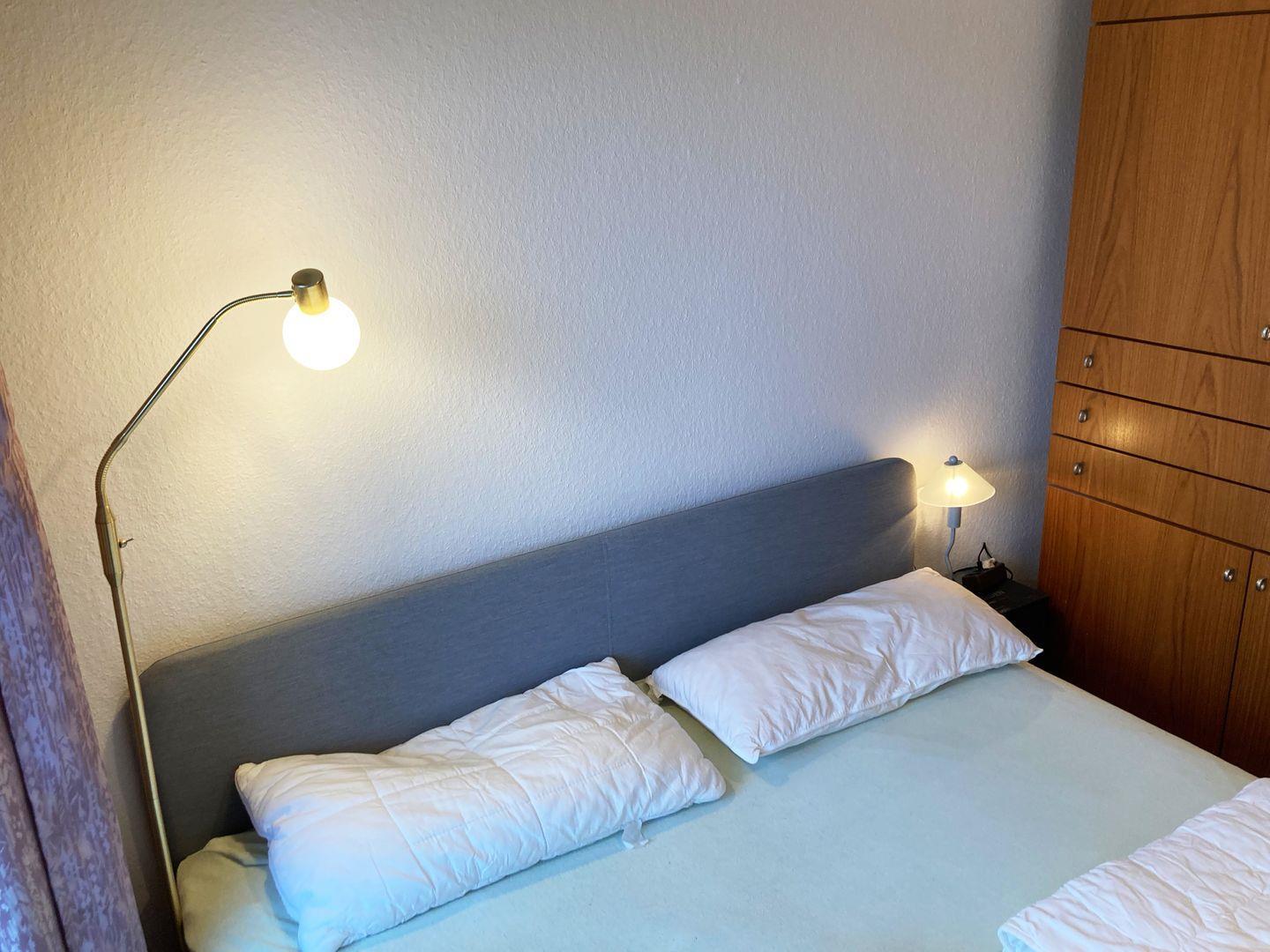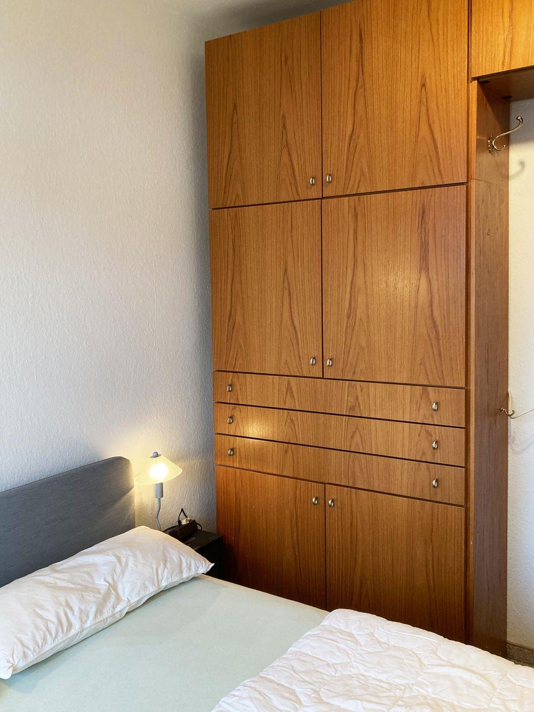 Im hellen Schlafzimmer sorgen Verdunklungsvorhänge für Privatsphäre. Ein Doppelbett und ein großer Einbauschrank stehen hier bereit.