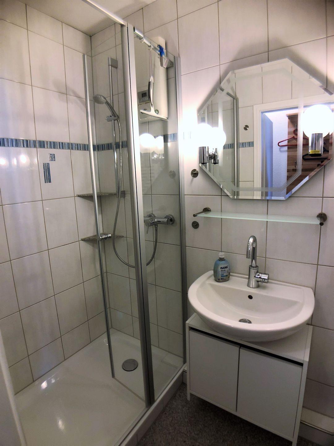 Das kleine, moderne Duschbad bietet eine Dusche mit Wanne und fester Glasduschwand, Waschbecken mit Unterschrank, Haartrockner, Beleuchtung und Steckdosen sowie WC und Handtuchheizkörper.